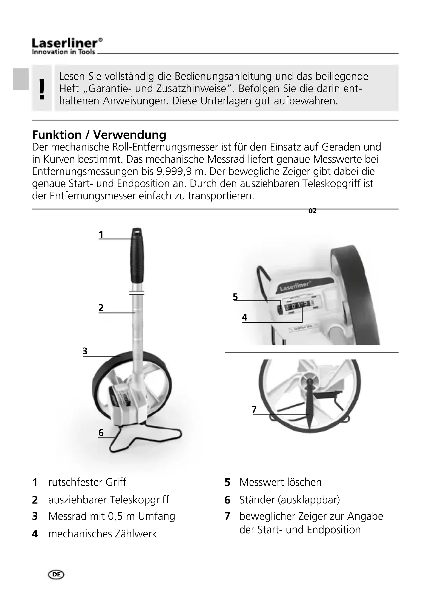 Funktion / Verwendung Der mechanische Roll-Entfernungsmesser ist für den Einsatz auf Geraden und in Kurven bestimmt. Das mechanische Messrad liefert genaue Messwerte bei Entfernungsmessungen bis 9.999,9 m. Der bewegliche Zeiger gibt dabei die genaue Start- und Endposition an. Durch den ausziehbaren Teleskopgriff ist der Entfernungsmesser einfach zu transportieren. rutschfester Griff ausziehbarer Teleskopgriff Messrad mit 0,5 m Umfang mechanisches Zählwerk Messwert löschen Ständer (ausklappbar) beweglicher Zeiger zur Angabe der Start- und Endposition