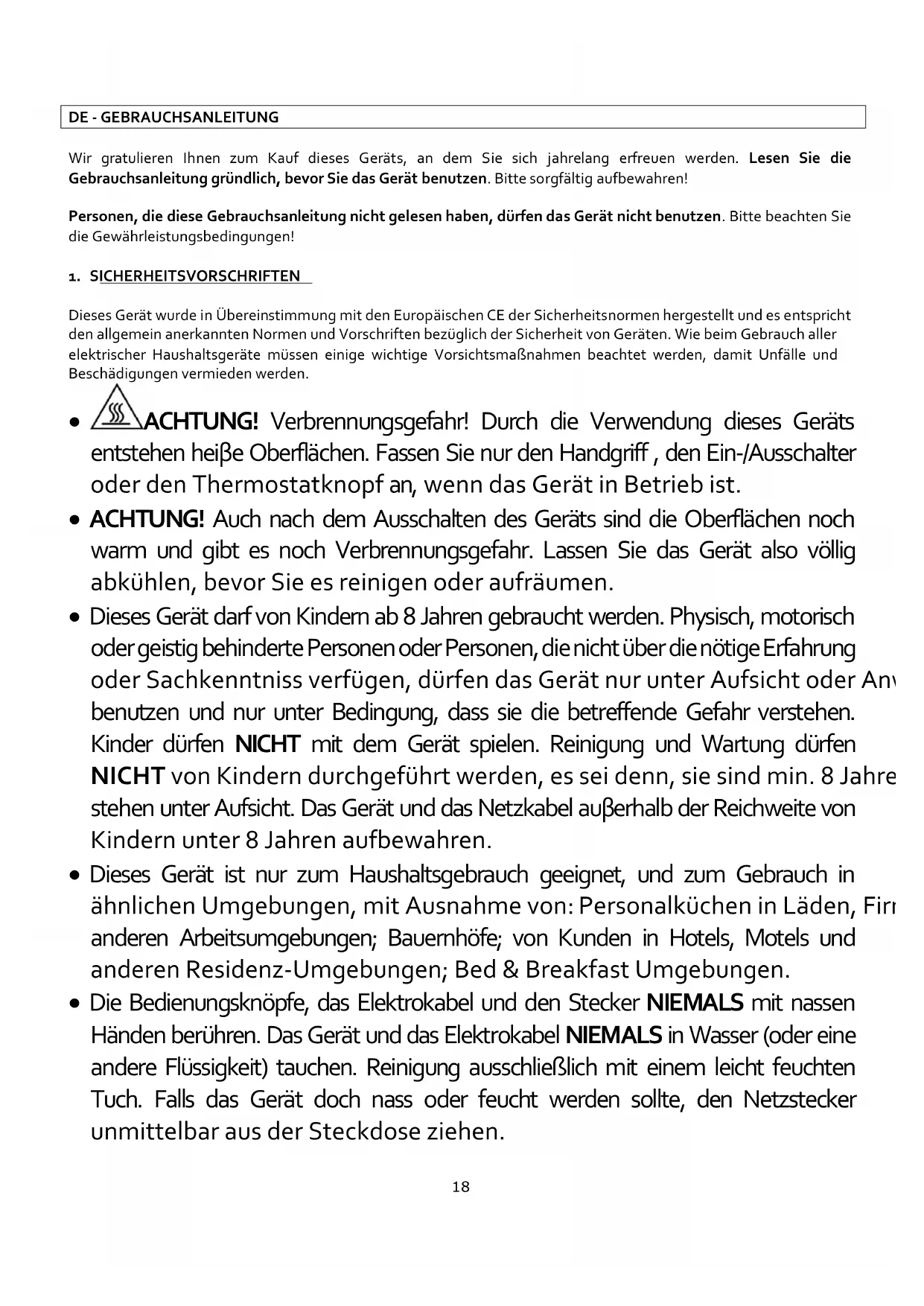 - ACHTUNG! Verbrennungsgefahr! Durch die Verwendung dieses Geräts entstehen heiβe Oberflächen. Fassen Sie nur den Handgriff , den Ein-/Ausschalter oder den Thermostatknopf an, wenn das Gerät in Betrieb ist.