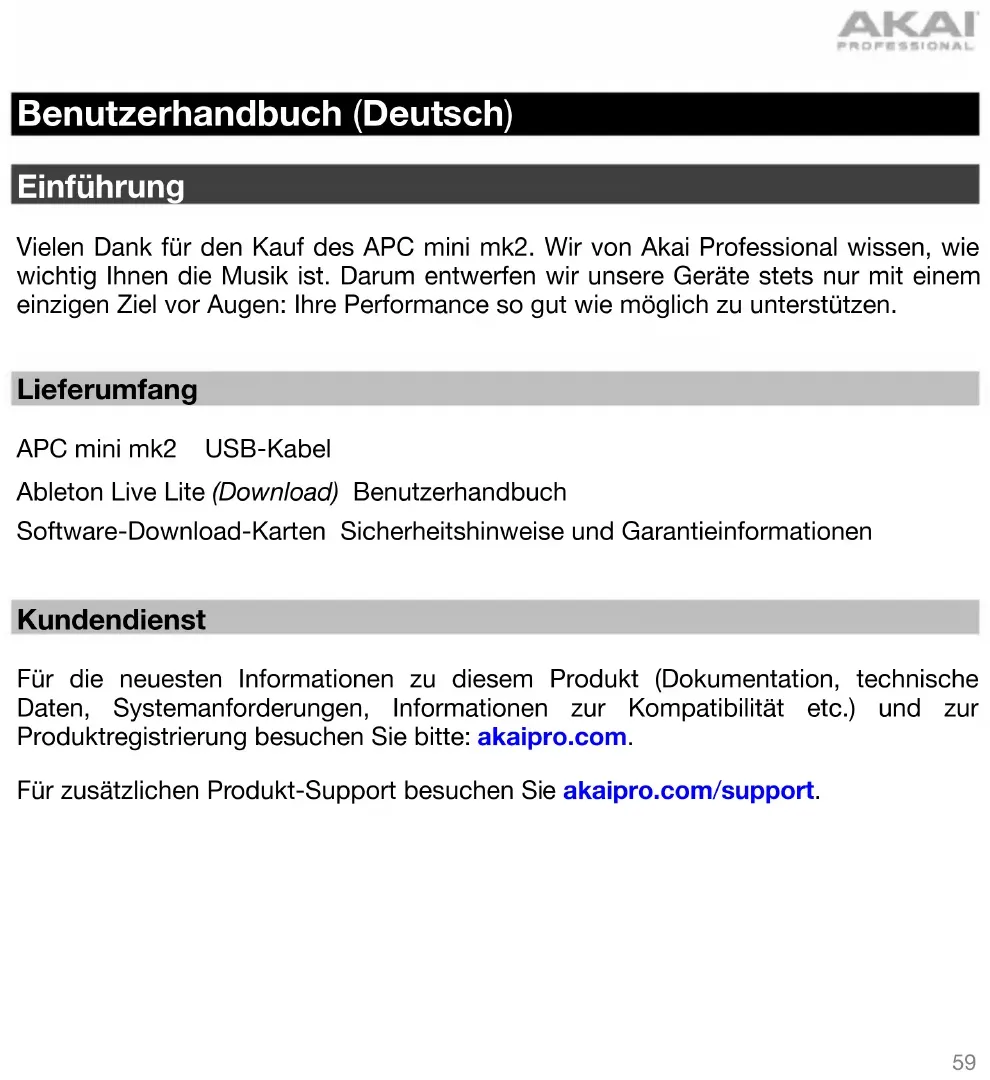 Per uscire dalla modifica della modalità Note Mode, lasciare i tasti Shift e il settimo tasto Scene Launch (Note), e i tasti Clip cambieranno colore per riflettere le scelte aggiornate.59 Benutzerhandbuch (Deutsch) Einführung Vielen Dank für den Kauf des APC mini mk2. Wir von Akai Professional wissen, wie wichtig Ihnen die Musik ist. Darum entwerfen wir unsere Geräte stets nur mit einem einzigen Ziel vor Augen: Ihre Performance so gut wie möglich zu unterstützen. Lieferumfang APC mini mk2 USB-Kabel Ableton Live Lite (Download) Benutzerhandbuch Software-Download-Karten Sicherheitshinweise und Garantieinformationen Kundendienst Für die neuesten Informationen zu diesem Produkt (Dokumentation, technische Daten, Systemanforderungen, Informationen zur Kompatibilität etc.) und zur Produktregistrierung besuchen Sie bitte: akaipro.com. Für zusätzlichen Produkt-Support besuchen Sie akaipro.com/support.60 Setup
