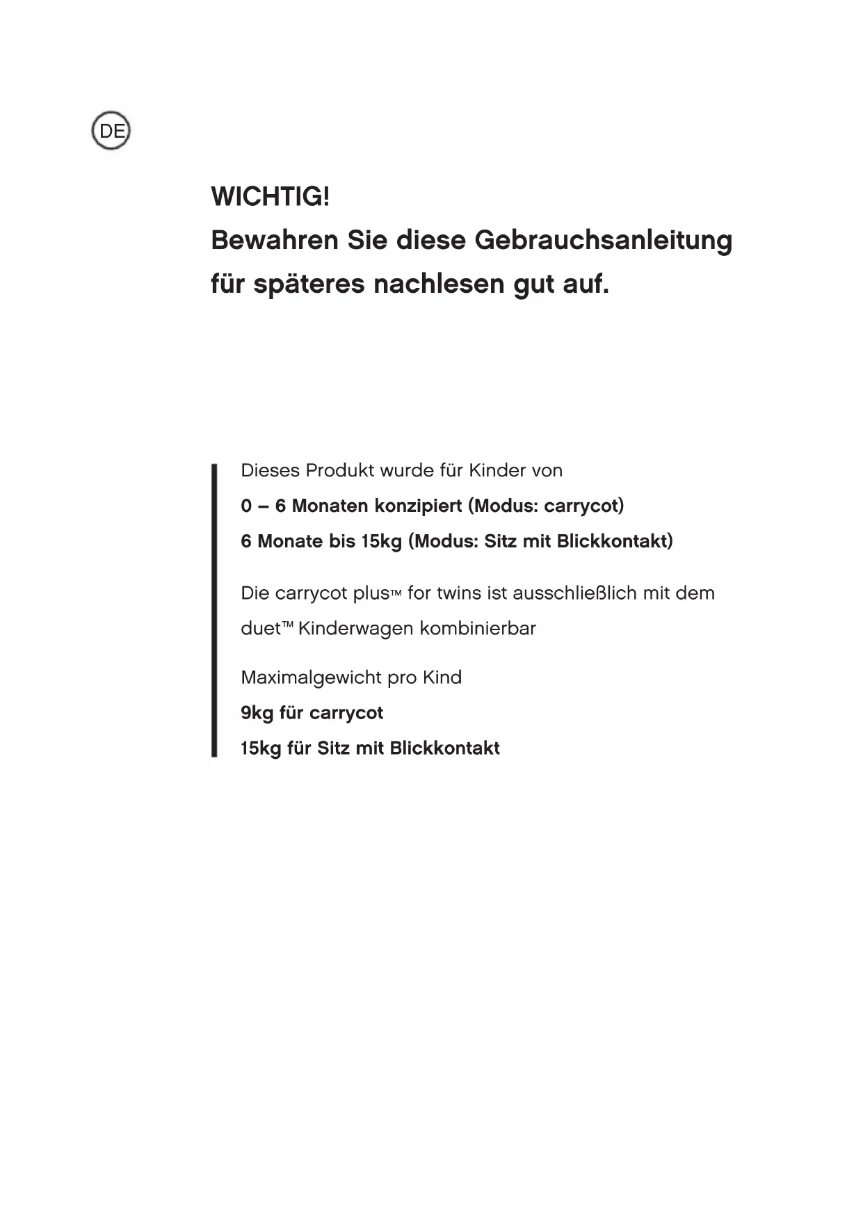 Dieses Produkt wurde für Kinder von 0 – 6 Monaten konzipiert (Modus: carrycot) 6 Monate bis 15kg (Modus: Sitz mit Blickkontakt) Die carrycot plus™ for twins ist ausschließlich mit dem duet