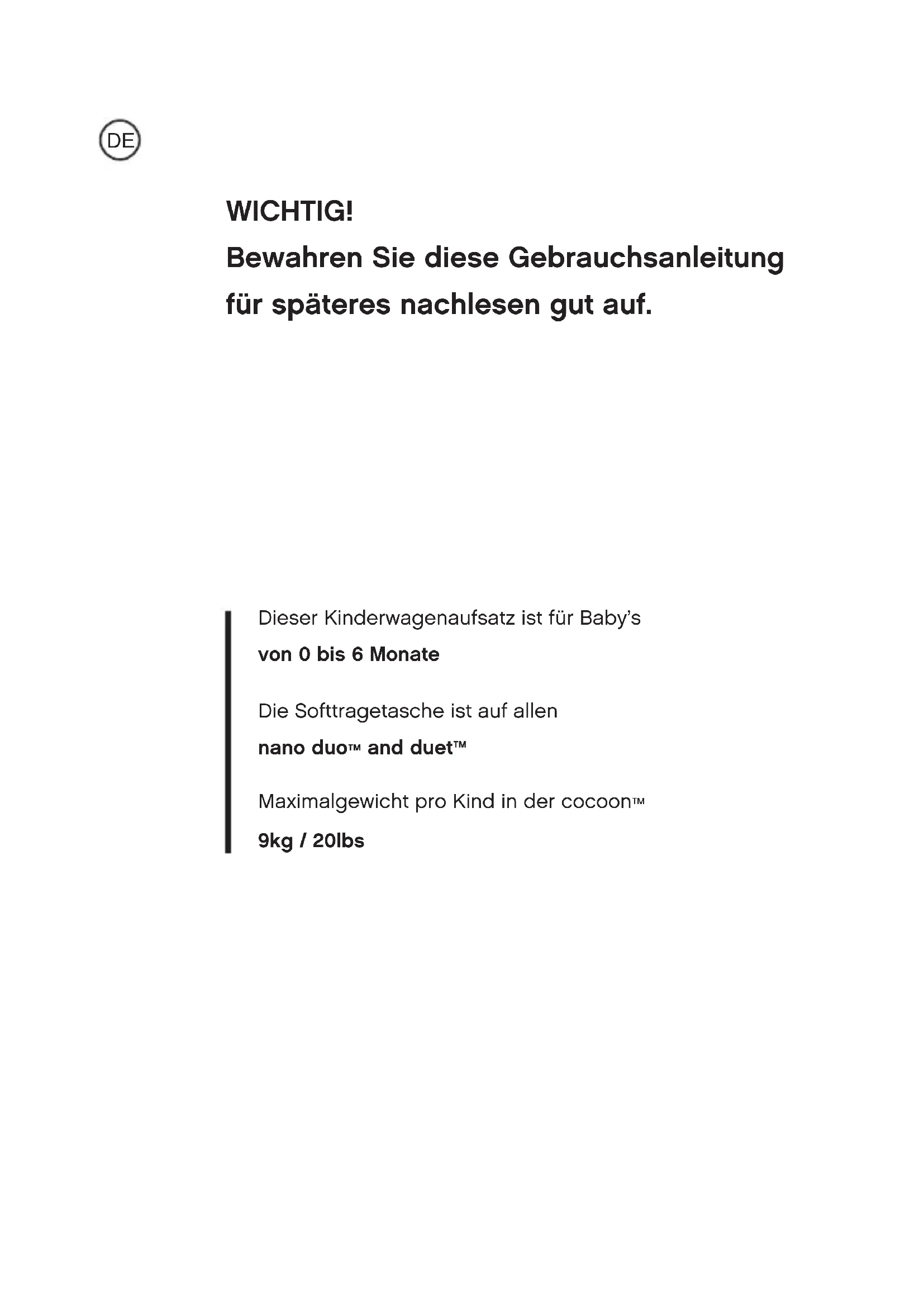 © 2020 Phil and Teds Design Limited. Phil and Teds Design Limited sind Eigentümer aller geistigen Eigentumsrechte für unsere in dieser Veröffentlichung aufgeführten Marken, Designs und Erfindungen, für die die Phil and Teds Most Excellent Buggy Company Limited die Lizenzen innehat. Dazu gehören u. a. die Marken Mountain Buggy und life without limit sowie die Produktnamen. Personen, die unsere Eigentumsrechte verletzen, werden von uns aktiv strafrechtlich verfolgt.cocoon™ Este destinado a bebés de 0 a 6 meses de edad. El cocoon™ es compatible nano duo™ and duet