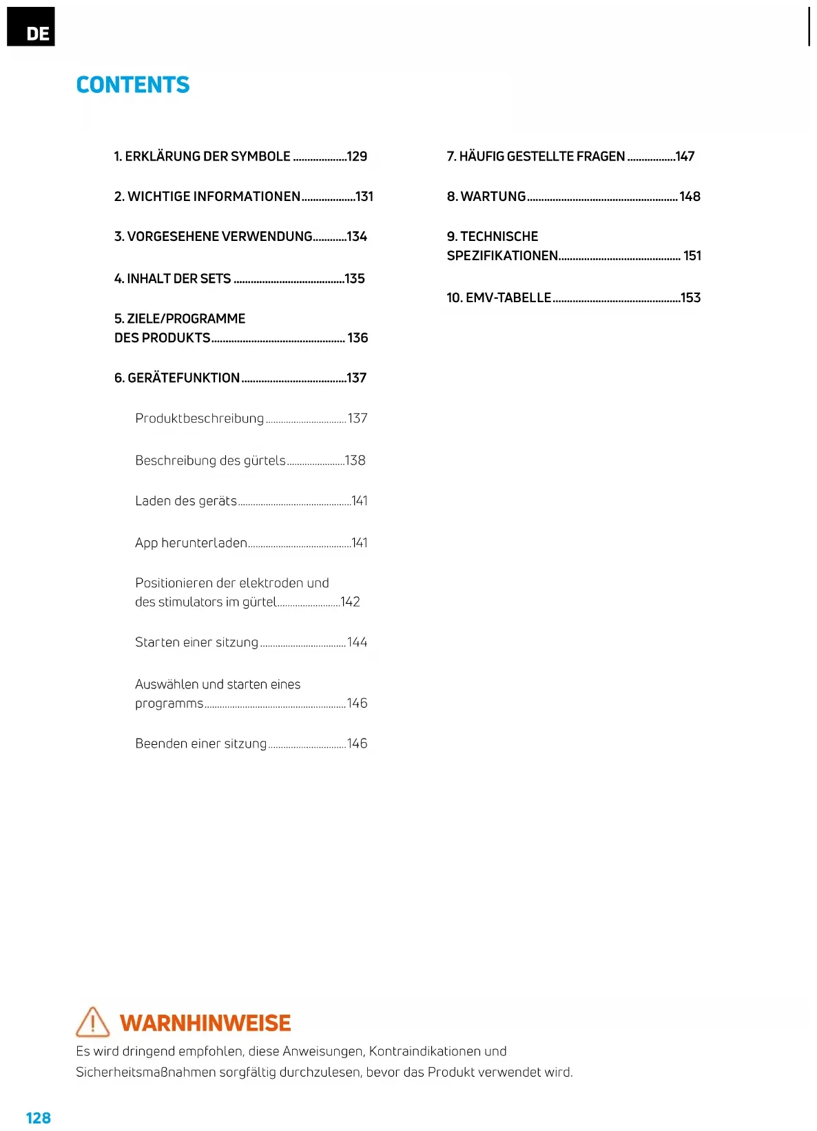 - BESCHÄDIGUNG DES GERÄTS UND ZUBEHÖRS. Verwenden Sie das Gerät oder die Zubehörteile nicht, wenn sie beschädigt sind. Kontrollieren Sie vor jeder Verwendung das Gerät, die Anschlüsse und Bandage.132