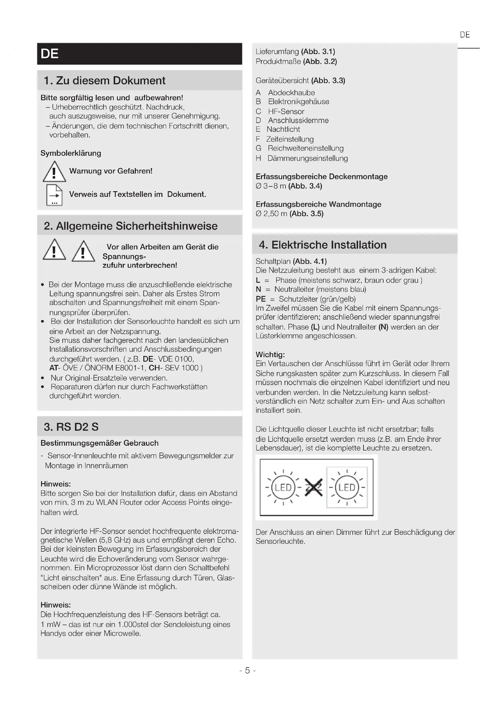 - Bei der Montage muss die anzuschließende elektrische Leitung spannungsfrei sein. Daher als Erstes Strom abschalten und Spannungsfreiheit mit einem Span-nungsprüfer überprüfen. • Bei der Installation der Sensorleuchte handelt es sich um eine Arbeit an der Netzspannung. Sie muss daher fachgerecht nach den landesüblichen Installationsvorschriften und Anschlussbedingungen durchgeführt werden. ( z.B. DE- VDE 0100, AT- ÖVE / ÖNORM E8001-1, CH- SEV 1000 )• Nur Original-Ersatzteile verwenden.• Reparaturen dürfen nur durch Fachwerkstätten durchgeführt werden. 3 RS D2 S Bestimmungsgemäßer Gebrauch- Sensor-Innenleuchte mit aktivem Bewegungsmelder zur Montage in InnenräumenHinweis:Bitte sorgen Sie bei der Installation dafür, dass ein Abstand von min. 3 m zu WLAN Router oder Access Points einge-halten wird.Der integrierte HF-Sensor sendet hochfrequente elektroma-gnetische Wellen (5,8 GHz) aus und empfängt deren Echo. Bei der kleinsten Bewegung im Erfassungsbereich der Leuchte wird die Echoveränderung vom Sensor wahrge-nommen. Ein Microprozessor löst dann den Schaltbefehl "Licht einschalten" aus. Eine Erfassung durch Türen, Glas-scheiben oder dünne Wände ist möglich. Hinweis: Die Hochfrequenzleistung des HF-Sensors beträgt ca. 1mW – das ist nur ein 1.000stel der Sendeleistung eines Handys oder einer Microwelle.
