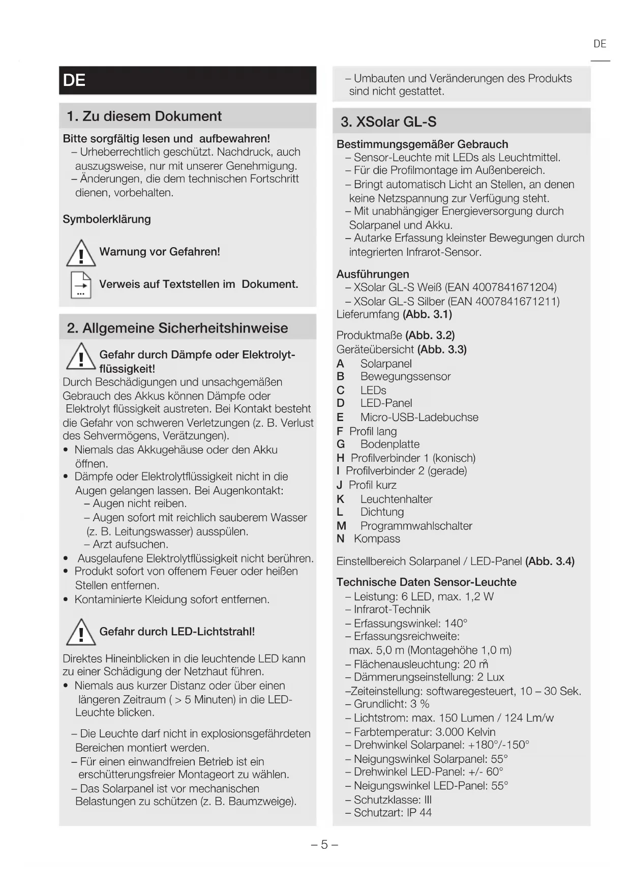 Bestimmungsgemäßer Gebrauch – Sensor-Leuchte mit LEDs als Leuchtmittel. – Für die Profilmontage im Außenbereich. – Bringt automatisch Licht an Stellen, an denen keine Netzspannung zur Verfügung steht. – Mit unabhängiger Energieversorgung durch Solarpanel und Akku. – Autarke Erfassung kleinster Bewegungen durch integrierten Infrarot-Sensor. Ausführungen – XSolar GL-S Weiß (EAN4007841671204) – XSolar GL-S Silber (EAN4007841671211) Lieferumfang (Abb. 3.1) Produktmaße (Abb. 3.2) Geräteübersicht (Abb. 3.3) A Solarpanel B Bewegungssensor C LEDs D LED-Panel E Micro-USB-Ladebuchse F Profil lang G Bodenplatte H Profilverbinder 1 (konisch) I Profilverbinder 2 (gerade) J Profil kurz K Leuchtenhalter L Dichtung M Programmwahlschalter N Kompass Einstellbereich Solarpanel/LED-Panel (Abb. 3.4) Technische Daten Sensor-Leuchte – Leistung: 6 LED, max. 1,2 W – Infrarot-Technik – Erfassungswinkel: 140° – Erfassungsreichweite: max. 5,0 m (Montagehöhe 1,0 m) – Flächenausleuchtung: 20 m