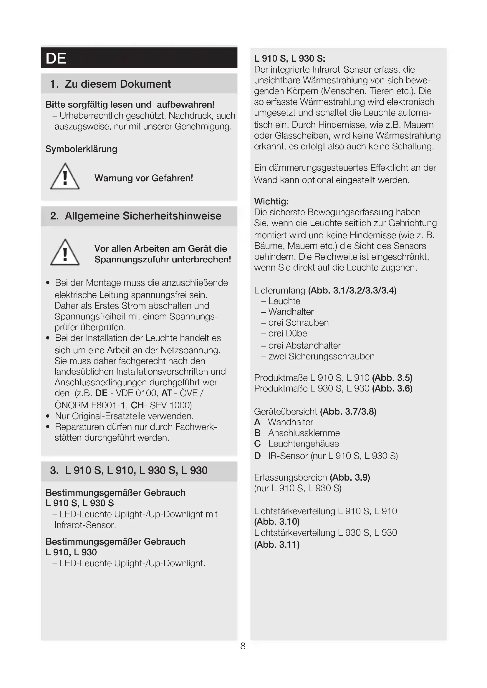 - Reparaturen dürfen nur durch Fachwerk- stätten durchgeführt werden. 3 L910S, L910, L930S, L930 Bestimmungsgemäßer Gebrauch L910S, L930S – LED-Leuchte Uplight-/Up-Downlight mit Infrarot-Sensor. Bestimmungsgemäßer Gebrauch L910, L930 – LED-Leuchte Uplight-/Up-Downlight. L910S, L930S: Der integrierte Infrarot-Sensor erfasst die unsichtbare Wärmestrahlung von sich bewe- genden Körpern (Menschen, Tieren etc.). Die so erfasste Wärmestrahlung wird elektronisch umgesetzt und schaltet die Leuchte automa- tisch ein. Durch Hindernisse, wie z.B. Mauern oder Glasscheiben, wird keine Wärmestrahlung erkannt, es erfolgt also auch keine Schaltung. Ein dämmerungsgesteuertes Eektlicht an der Wand kann optional eingestellt werden. Wichtig: Die sicherste Bewegungserfassung haben Sie, wenn die Leuchte seitlich zur Gehrichtung montiert wird und keine Hindernisse (wie z. B. Bäume, Mauern etc.) die Sicht des Sensors behindern. Die Reichweite ist eingeschränkt, wenn Sie direkt auf die Leuchte zugehen. Lieferumfang (Abb 31/32/33/34) – Leuchte – Wandhalter – drei Schrauben – drei Dübel – drei Abstandhalter – zwei Sicherungsschrauben Produktmaße L910S, L910 (Abb 35) Produktmaße L930S, L930 (Abb 36) Geräteübersicht (Abb 37/38) A Wandhalter B Anschlussklemme C Leuchtengehäuse D IR-Sensor (nur L910S, L930S) Erfassungsbereich (Abb 39) (nur L910S, L930S) Lichtstärkeverteilung L910S, L910 (Abb 310) Lichtstärkeverteilung L930S, L930 (Abb 311)9 4 Elektrischer Anschluss Schaltplan (Abb 41) Die Netzzuleitung besteht aus einem 3-adrigen Kabel: L = Phase (meistens schwarz, braun oder grau) N = Neutralleiter (meistens blau) PE = Schutzleiter (grün/gelb) K = Kommunikationsleitung (optional) (nur L910S, L930S) Im Zweifel müssen Sie die Leitungen mit einem Spannungsprüfer identifizieren; anschließend wieder spannungsfrei schalten. Phase (L) und Neutralleiter (N) werden an der Anschlussklem- me angeschlossen, Schutzleiter (PE) wird an der Klemme (E) angeschlossen. (Abb 55/56) Wichtig: Ein Vertauschen der Anschlüsse führt im Gerät oder Sicherungskasten später zum Kurz- schluss. In diesem Fall müssen nochmals die einzelnen Leitungen identifiziert und neu verbunden werden. In die Netzzuleitung kann selbstverständlich ein Netzschalter zum Ein- und Ausschalten installiert sein. Die Lichtquelle dieser Leuchte ist nicht ersetzbar; falls die Lichtquelle ersetzt werden muss (z.B. am Ende ihrer Lebensdauer), ist die komplette Leuchte zu ersetzen. Gruppenverhalten Über die Kommunikationsleitung (K) ist eine STEINEL-interne Gruppenvernetzung von L910S, L930S möglich. Hierzu die Abdeck- lasche im Anschlussraum herausbrechen. (Abb 42) Es können maximal 10 Leuchten miteinander vernetzt werden. Die maximale Länge der Kommunikationsleitung beträgt 50 m. Die erste Leuchte einer Gruppe, die Bewegung erfasst, schaltet die gesamte Gruppe EIN. Wird nach Ablauf der Zeiteinstellung keine weitere Bewegung erfasst, schaltet die letzte Leuchte einer Gruppe die gesamte Gruppe AUS. Hinweis: – Auf die Kommunikationsleitung darf keine Spannung gegeben werden. Keine externen Lasten schalten! – Innerhalb der Gruppenvernetzung folgen alle Leuchten ihren individuell per DIP-Schalter eingestellten Werten. – Im Testmodus ist eine Gruppenvernetzung nicht möglich. 5 Montage