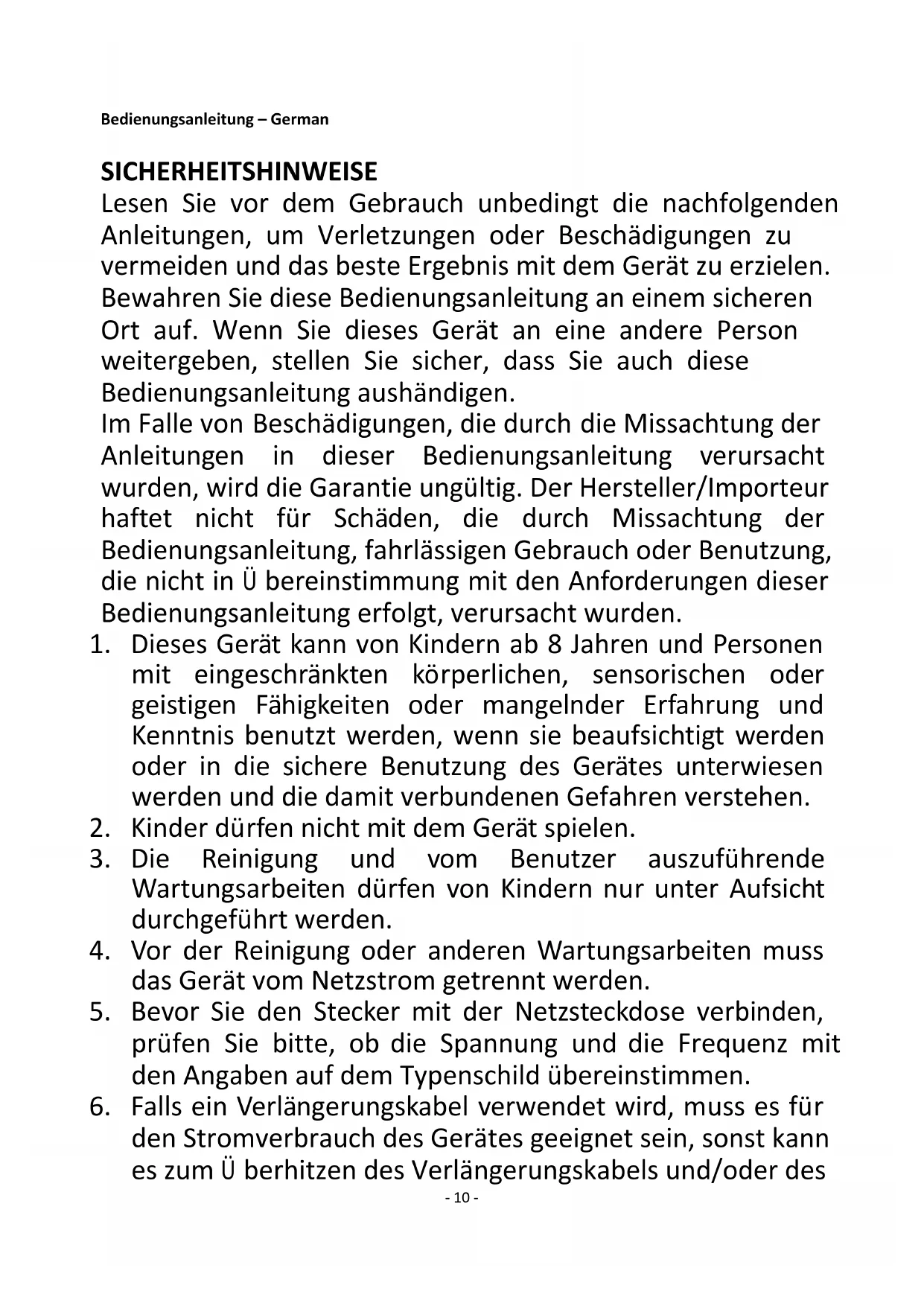 den Stromverbrauch des Gerätes geeignet sein, sonst kann es zum Überhitzen des Verlängerungskabels und/oder des- 11 - Steckers kommen. Es besteht Verletzungsgefahr durch Stolpern über das Verlängerungskabel. Lassen Sie Vorsicht walten, um gefährliche Situationen zu vermeiden.