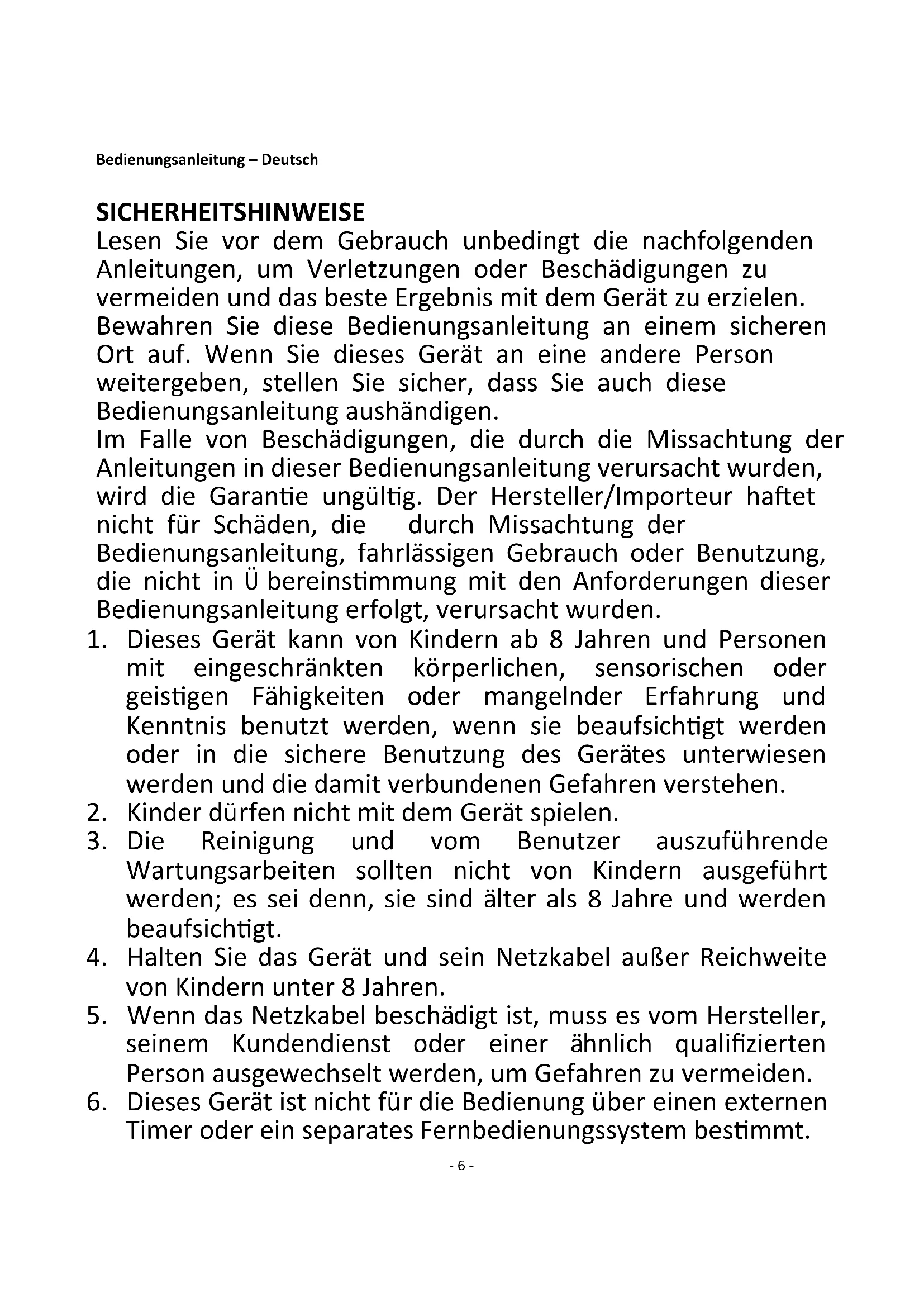 1. Dieses Gerät ist nur für den Heimgebrauch bestimmt.