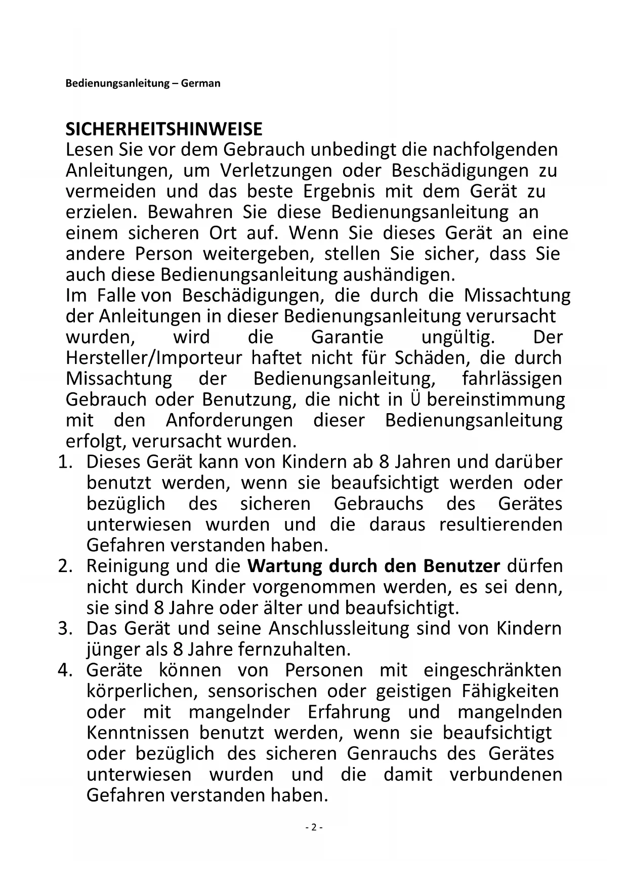 körperlichen, sensorischen oder geistigen Fähigkeiten oder mit mangelnder Erfahrung und mangelnden Kenntnissen benutzt werden, wenn sie beaufsichtigt oder bezüglich des sicheren Genrauchs des Gerätes unterwiesen wurden und die damit verbundenen Gefahren verstanden haben.- 3 -