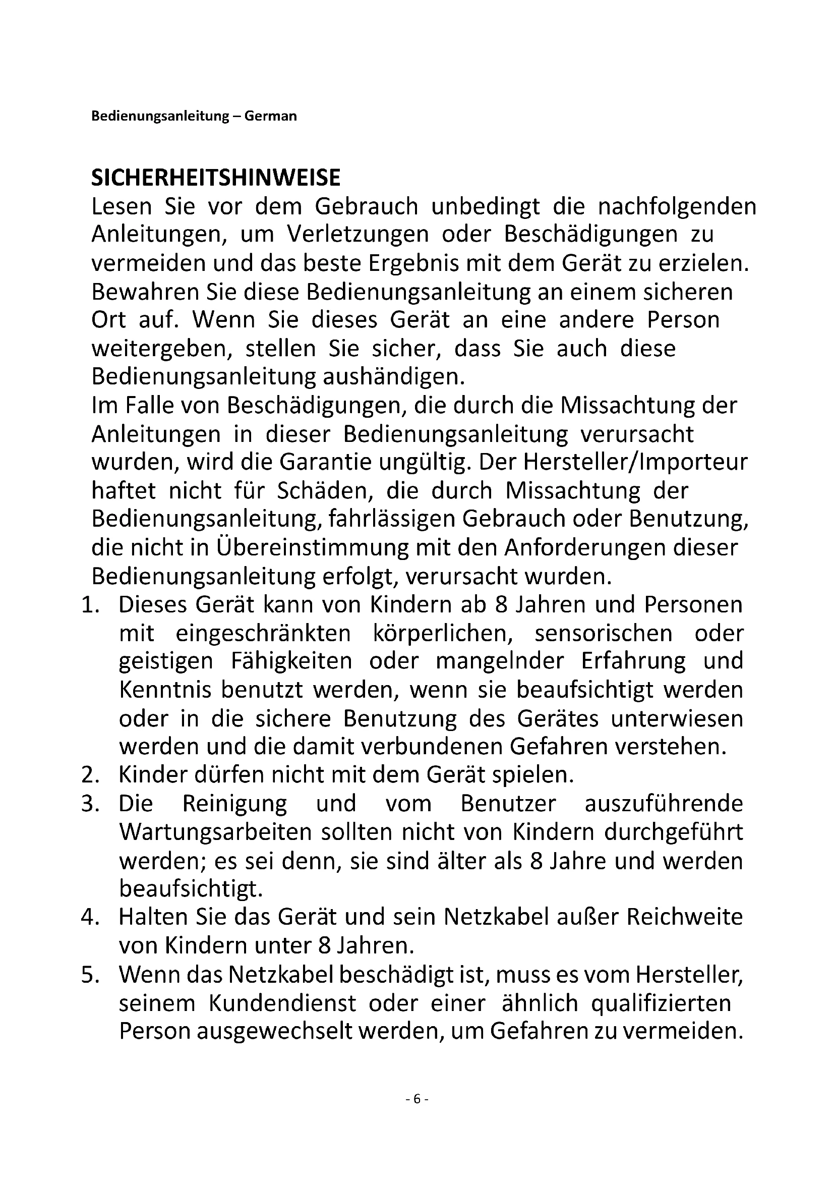 Recycling – European Directive 2012/19/EU This marking indicates that this product should not be disposed with other household wastes. To prevent possible harm to the environment or human health from uncontrolled waste disposal, recycle it responsibly to promote the sustainable reuse of material resources. To return your used device, please use the return and collection systems or contact the retailer where the product was purchased. They can take this product for environmental safe recycling. Manufactured by: Emerio B.V. Zomervaart 1A, 2033 DA Haarlem, The Netherlands- 6 - Bedienungsanleitung – German SICHERHEITSHINWEISE Lesen Sie vor dem Gebrauch unbedingt die nachfolgenden Anleitungen, um Verletzungen oder Beschädigungen zu vermeiden und das beste Ergebnis mit dem Gerät zu erzielen. Bewahren Sie diese Bedienungsanleitung an einem sicheren Ort auf. Wenn Sie dieses Gerät an eine andere Person weitergeben, stellen Sie sicher, dass Sie auch diese Bedienungsanleitung aushändigen. Im Falle von Beschädigungen, die durch die Missachtung der Anleitungen in dieser Bedienungsanleitung verursacht wurden, wird die Garantie ungültig. Der Hersteller/Importeur haftet nicht für Schäden, die durch Missachtung der Bedienungsanleitung, fahrlässigen Gebrauch oder Benutzung, die nicht in Übereinstimmung mit den Anforderungen dieser Bedienungsanleitung erfolgt, verursacht wurden.
