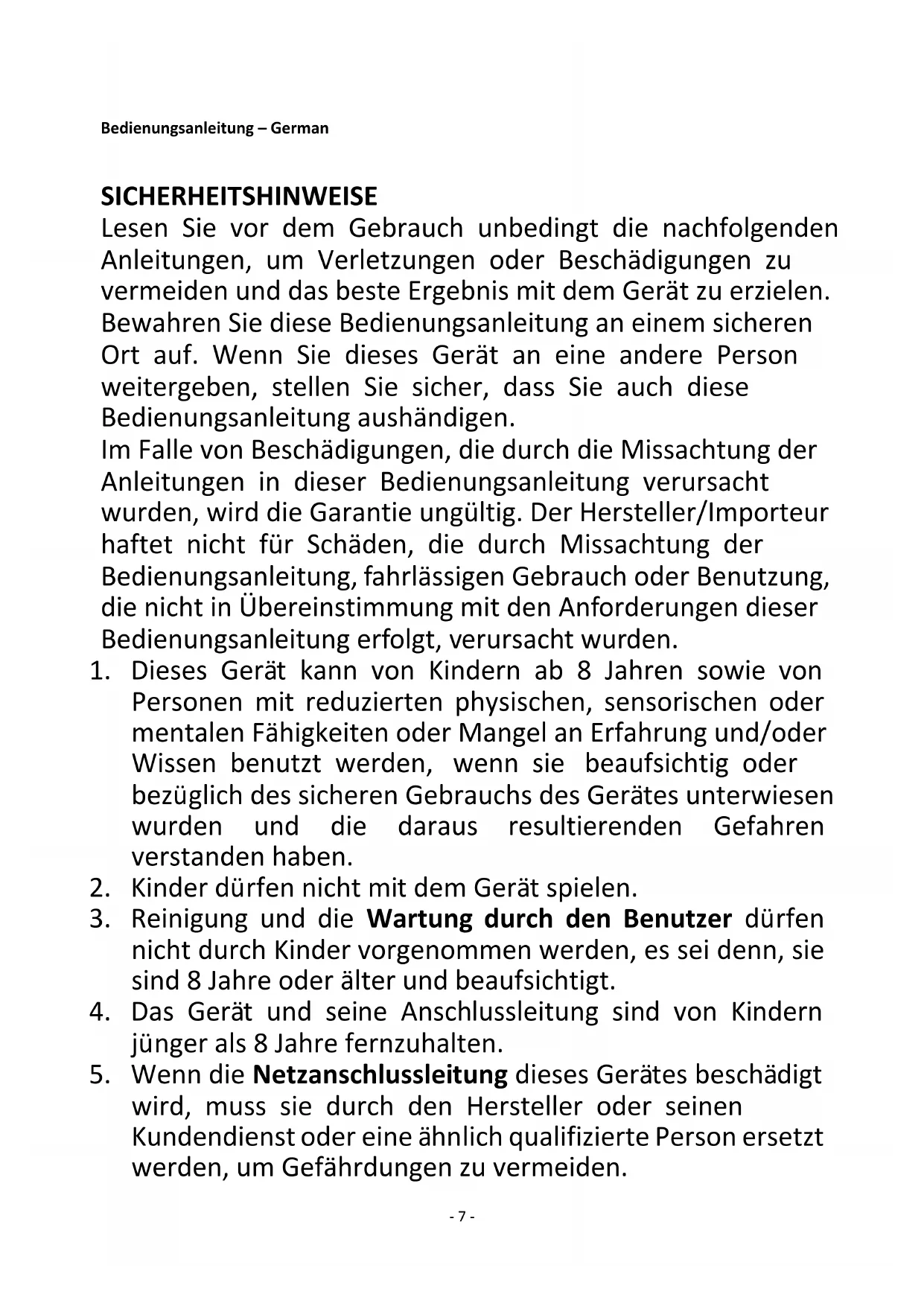 Recycling – European Directive 2012/19/EU This marking indicates that this product should not be disposed with other household wastes. To prevent possible harm to the environment or human health from uncontrolled waste disposal, recycle it responsibly to promote the sustainable reuse of material resources. To return your used device, please use the return and collection systems or contact the retailer where the product was purchased. They can take this product for environmental safe recycling. Emerio Deutschland GmbH (no service address) Lerchenweg 3 40789 Monheim am Rhein Deutschland Customer service: T: +49 (0) 3222 1097 600 E: info.de@emerio.eu- 7 - Bedienungsanleitung – German SICHERHEITSHINWEISE Lesen Sie vor dem Gebrauch unbedingt die nachfolgenden Anleitungen, um Verletzungen oder Beschädigungen zu vermeiden und das beste Ergebnis mit dem Gerät zu erzielen. Bewahren Sie diese Bedienungsanleitung an einem sicheren Ort auf. Wenn Sie dieses Gerät an eine andere Person weitergeben, stellen Sie sicher, dass Sie auch diese Bedienungsanleitung aushändigen. Im Falle von Beschädigungen, die durch die Missachtung der Anleitungen in dieser Bedienungsanleitung verursacht wurden, wird die Garantie ungültig. Der Hersteller/Importeur haftet nicht für Schäden, die durch Missachtung der Bedienungsanleitung, fahrlässigen Gebrauch oder Benutzung, die nicht in Übereinstimmung mit den Anforderungen dieser Bedienungsanleitung erfolgt, verursacht wurden.