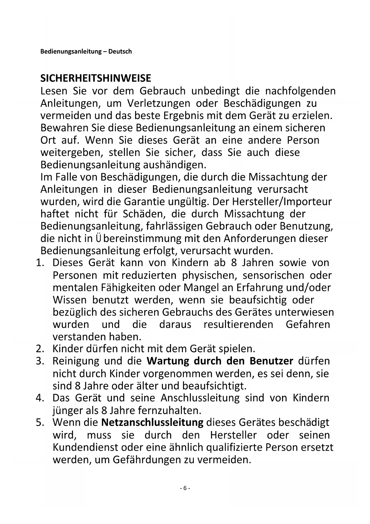 7. Dieses Gerät ist für die Verwendung im Haushalt oder für