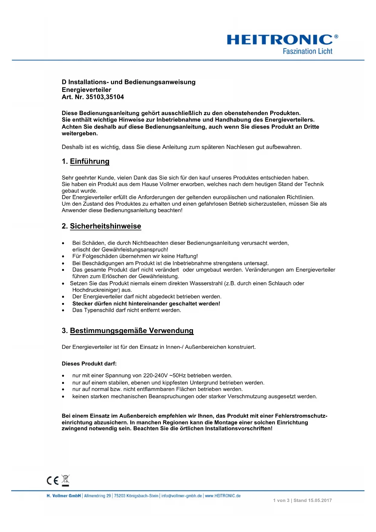 1 von 3 | Stand 15.05.2017 D Installations- und Bedienungsanweisung Energieverteiler Art. Nr. 35103,35104 Diese Bedienungsanleitung gehört ausschließlich zu den obenstehenden Produkten. Sie enthält wichtige Hinweise zur Inbetriebnahme und Handhabung des Energieverteilers. Achten Sie deshalb auf diese Bedienungsanleitung, auch wenn Sie dieses Produkt an Dritte weitergeben. Deshalb ist es wichtig, dass Sie diese Anleitung zum späteren Nachlesen gut aufbewahren.