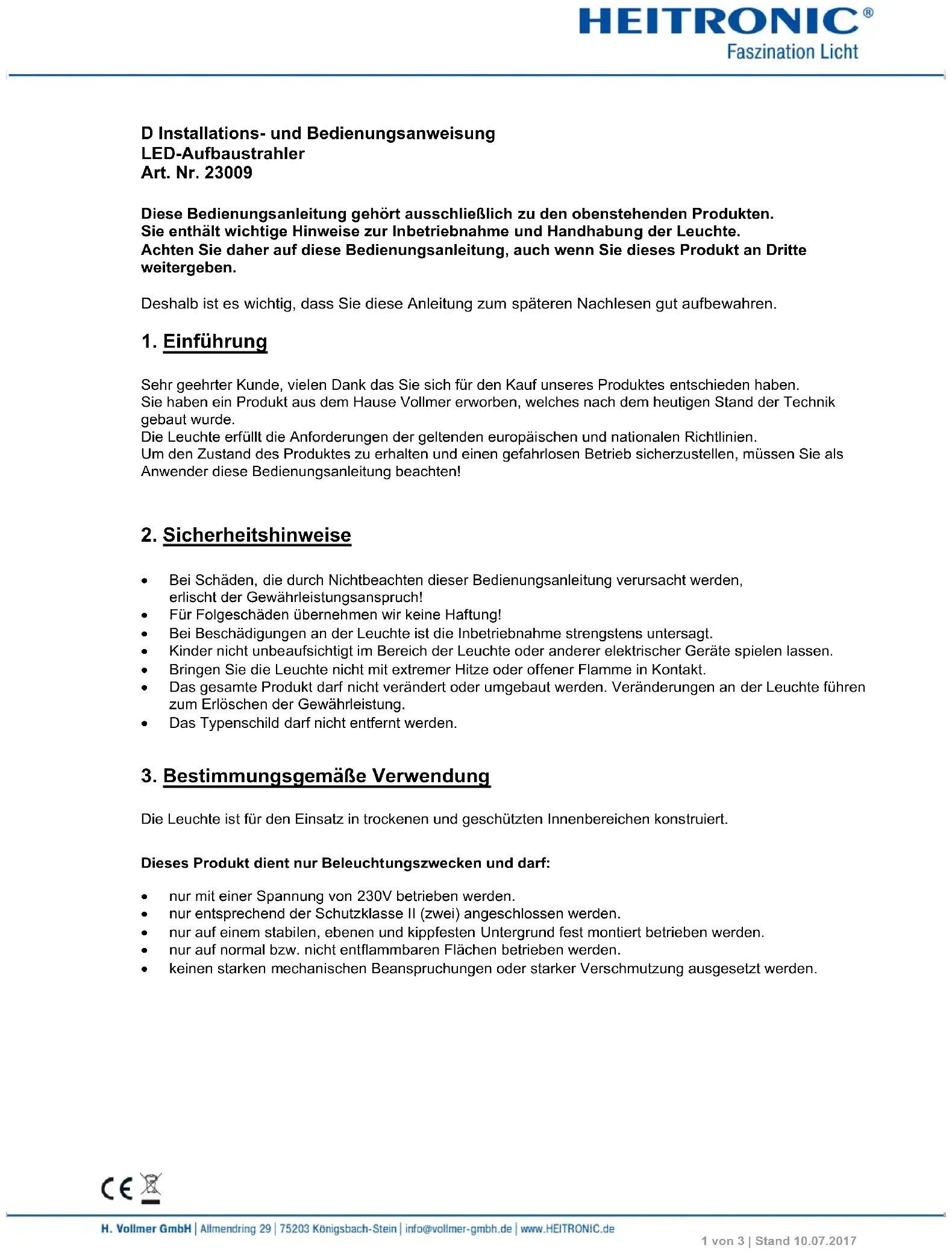1 von 3 | Stand 10.07.2017 D Installations- und Bedienungsanweisung LED-Aufbaustrahler Art. Nr. 23009 Diese Bedienungsanleitung gehört ausschließlich zu den obenstehenden Produkten. Sie enthält wichtige Hinweise zur Inbetriebnahme und Handhabung der Leuchte. Achten Sie daher auf diese Bedienungsanleitung, auch wenn Sie dieses Produkt an Dritte weitergeben. Deshalb ist es wichtig, dass Sie diese Anleitung zum späteren Nachlesen gut aufbewahren.