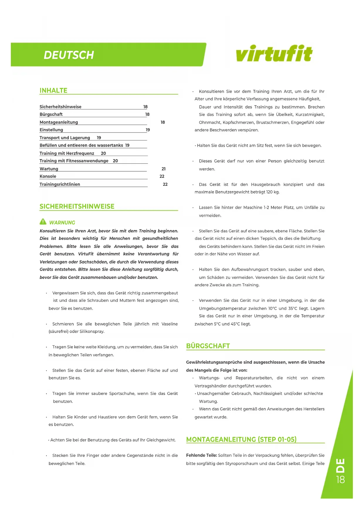 INHALTE Sicherheitshinweise 18 Bürgschaft 18 Montageanleitung 18 Einstellung 19 Transport und Lagerung 19 Befüllen und entleeren des wassertanks 19 Training mit Herzfrequenz 20 Training mit Fitnessanwendunge 20 Wartung 21 Konsole 22 Trainingsrichtlinien 22 SICHERHEITSHINWEISE WARNUNG Konsultieren Sie Ihren Arzt, bevor Sie mit dem Training beginnen. Dies ist besonders wichtig für Menschen mit gesundheitlichen Problemen. Bitte lesen Sie alle Anweisungen, bevor Sie das Gerät benutzen. VirtuFit übernimmt keine Verantwortung für Verletzungen oder Sachschäden, die durch die Verwendung dieses Geräts entstehen. Bitte lesen Sie diese Anleitung sorgfältig durch, bevor Sie das Gerät zusammenbauen und/oder benutzen.