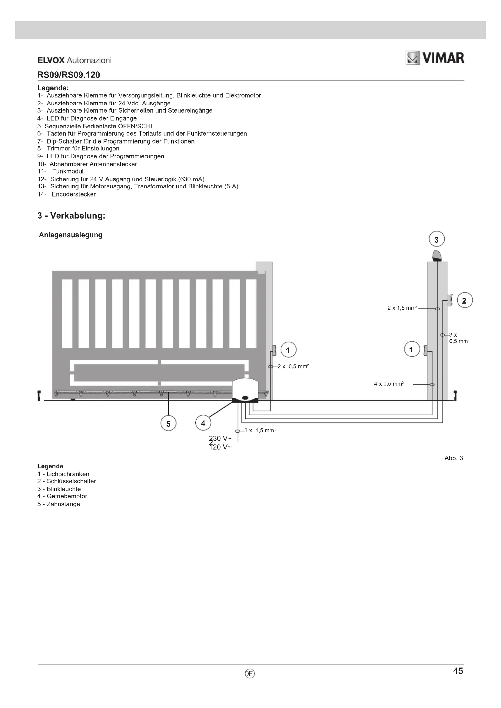 DE45 RS09/RS09.120 Legende: 1- Ausziehbare Klemme für Versorgungsleitung, Blinkleuchte und Elektromotor2- Ausziehbare Klemme für 24 Vdc Ausgänge3- Ausziehbare Klemme für Sicherheiten und Steuereingänge4- LED für Diagnose der Eingänge5 Sequenzielle Bedientaste ÖFFN/SCHL6- Tasten für Programmierung des Torlaufs und der Funkfernsteuerungen7- Dip-Schalter für die Programmierung der Funktionen8- Trimmer für Einstellungen9- LED für Diagnose der Programmierungen10- Abnehmbarer Antennenstecker11- Funkmodul12- Sicherung für 24 V Ausgang und Steuerlogik (630 mA)13- Sicherung für Motorausgang, Transformator und Blinkleuchte (5 A)14- Encoderstecker