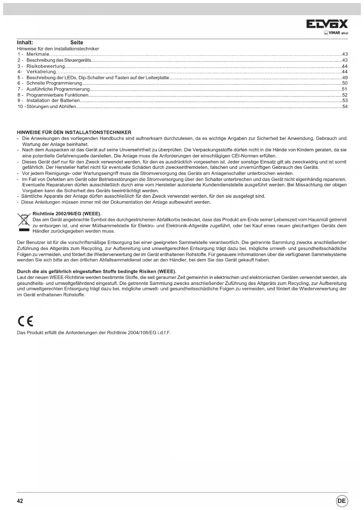 - Die Anweisungen des vorliegenden Handbuchs sind aufmerksam durchzulesen, da es wichtige Angaben zur Sicherheit bei Anwendung, Gebrauch und Wartung der Anlage beinhaltet. - Nach dem Auspacken ist das Gerät auf seine Unversehrtheit zu überprüfen. Die Verpackungsstoffe dürfen nicht in die Hände von Kindern geraten, da sie eine potentielle Gefahrenquelle darstellen. Die Anlage muss die Anforderungen der einschlägigen CEI-Normen erfüllen. - Dieses Gerät darf nur für den Zweck verwendet werden, für den es ausdrücklich vorgesehen ist. Jeder sonstige Einsatz gilt als zweckwidrig und ist somit gefährlich. Der Hersteller haftet nicht für eventuelle Schäden durch zweckentfremdeten, falschen und unvernünftigen Gebrauch des Geräts. - Vor jedem Reinigungs- oder Wartungseingriff muss die Stromversorgung des Geräts am Anlagenschalter unterbrochen werden. - Im Fall von Defekten am Gerät oder Betriebsstörungen die Stromversorgung über den Schalter unterbrechen und das Gerät nicht eigenhändig reparieren. Eventuelle Reparaturen dürfen ausschließlich durch eine vom Hersteller autorisierte Kundendienststelle ausgeführt werden. Bei Missachtung der obigen Vorgaben kann die Sicherheit des Geräts beeinträchtigt werden. - Sämtliche Apparate der Anlage dürfen ausschließlich für den Zweck verwendet werden, für den sie ausgelegt sind. - Diese Anleitungen müssen immer mit der Dokumentation der Anlage aufbewahrt werden. Richtlinie 2002/96/EG (WEEE). Das am Gerät angebrachte Symbol des durchgestrichenen Abfallkorbs bedeutet, dass das Produkt am Ende seiner Lebenszeit vom Hausmüll getrennt zu entsorgen ist, und einer Müllsammelstelle für Elektro- und Elektronik-Altgeräte zugeführt, oder bei Kauf eines neuen gleichartigen Geräts dem Händler zurückgegeben werden muss. Der Benutzer ist für die vorschriftsmäßige Entsorgung bei einer geeigneten Sammelstelle verantwortlich. Die getrennte Sammlung zwecks anschließender Zuführung des Altgeräts zum Recycling, zur Aufbereitung und umweltgerechten Entsorgung trägt dazu bei, mögliche umwelt- und gesundheitsschädliche Folgen zu vermeiden, und fördert die Wiederverwertung der im Gerät enthaltenen Rohstoffe. Für genauere Informationen über die verfügbaren Sammelsysteme wenden Sie sich bitte an den örtlichen Abfallsammeldienst oder an den Händler, bei dem Sie das Gerät gekauft haben. Durch die als gefährlich eingestuften Stoffe bedingte Risiken (WEEE). Laut der neuen WEEE-Richtlinie werden bestimmte Stoffe, die seit geraumer Zeit gemeinhin in elektrischen und elektronischen Geräten verwendet werden, als gesundheits- und umweltgefährdend eingestuft. Die getrennte Sammlung zwecks anschließender Zuführung des Altgeräts zum Recycling, zur Aufbereitung und umweltgerechten Entsorgung trägt dazu bei, mögliche umwelt- und gesundheitsschädliche Folgen zu vermeiden, und fördert die Wiederverwertung der im Gerät enthaltenen Rohstoffe. Das Produkt erfüllt die Anforderungen der Richtlinie 2004/108/EG i.d.f.F.DE