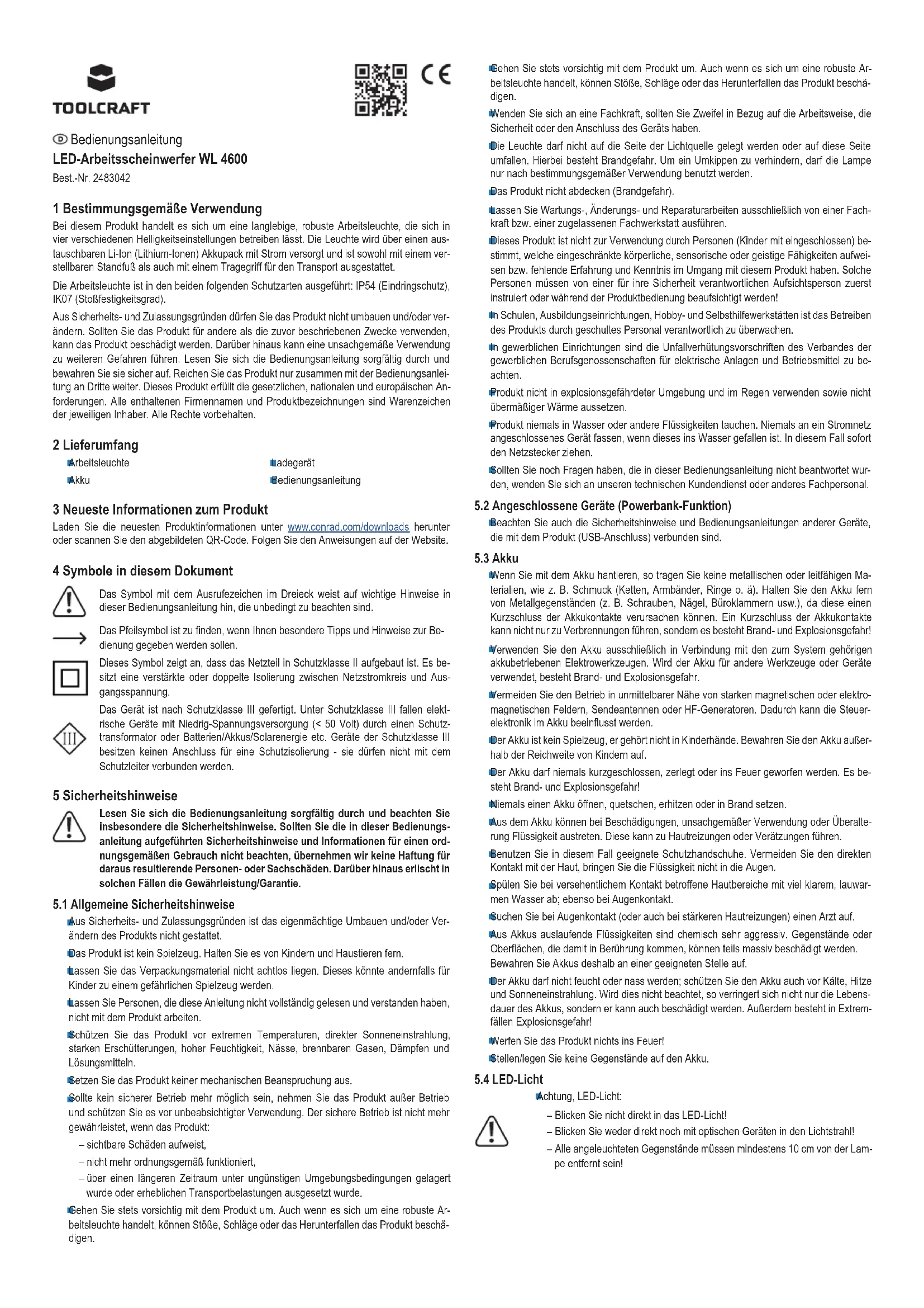 Achtung, LED-Licht: – Blicken Sie nicht direkt in das LED-Licht! – Blicken Sie weder direkt noch mit optischen Geräten in den Lichtstrahl! – Alle angeleuchteten Gegenstände müssen mindestens 10 cm von der Lam- pe entfernt sein! Bedienungsanleitung LED-Arbeitsscheinwerfer WL 4600 Best.-Nr. 2483042 1 Bestimmungsgemäße Verwendung Bei diesem Produkt handelt es sich um eine langlebige, robuste Arbeitsleuchte, die sich in vier verschiedenen Helligkeitseinstellungen betreiben lässt. Die Leuchte wird über einen aus- tauschbaren Li-Ion (Lithium-Ionen) Akkupack mit Strom versorgt und ist sowohl mit einem ver- stellbaren Standfuß als auch mit einem Tragegriff für den Transport ausgestattet. Die Arbeitsleuchte ist in den beiden folgenden Schutzarten ausgeführt: IP54 (Eindringschutz), IK07 (Stoßfestigkeitsgrad). Aus Sicherheits- und Zulassungsgründen dürfen Sie das Produkt nicht umbauen und/oder ver- ändern. Sollten Sie das Produkt für andere als die zuvor beschriebenen Zwecke verwenden, kann das Produkt beschädigt werden. Darüber hinaus kann eine unsachgemäße Verwendung zu weiteren Gefahren führen. Lesen Sie sich die Bedienungsanleitung sorgfältig durch und bewahren Sie sie sicher auf. Reichen Sie das Produkt nur zusammen mit der Bedienungsanlei- tung an Dritte weiter. Dieses Produkt erfüllt die gesetzlichen, nationalen und europäischen An- forderungen. Alle enthaltenen Firmennamen und Produktbezeichnungen sind Warenzeichen der jeweiligen Inhaber. Alle Rechte vorbehalten. 2 Lieferumfang