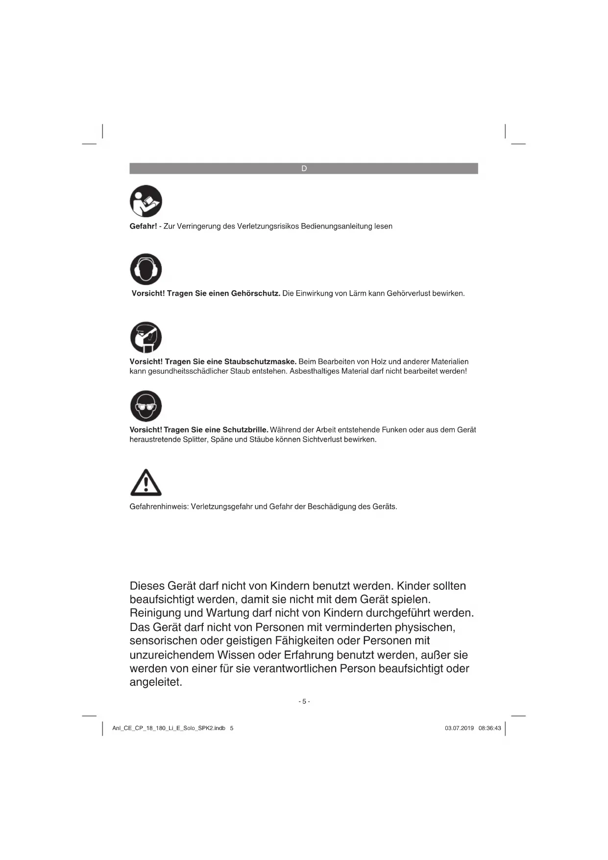 Gefahr! - Zur Verringerung des Verletzungsrisikos Bedienungsanleitung lesen Vorsicht! Tragen Sie einen Gehörschutz. Die Einwirkung von Lärm kann Gehörverlust bewirken. Vorsicht! Tragen Sie eine Schutzbrille. Während der Arbeit entstehende Funken oder aus dem Gerät heraustretende Splitter, Späne und Stäube können Sichtverlust bewirken. Vorsicht! Tragen Sie eine Staubschutzmaske. Beim Bearbeiten von Holz und anderer Materialien kann gesundheitsschädlicher Staub entstehen. Asbesthaltiges Material darf nicht bearbeitet werden! Gefahrenhinweis: Verletzungsgefahr und Gefahr der Beschädigung des Geräts. Dieses Gerät darf nicht von Kindern benutzt werden. Kinder sollten beaufsichtigt werden, damit sie nicht mit dem Gerät spielen. Reinigung und Wartung darf nicht von Kindern durchgeführt werden. Das Gerät darf nicht von Personen mit verminderten physischen, sensorischen oder geistigen Fähigkeiten oder Personen mit unzureichendem Wissen oder Erfahrung benutzt werden, außer sie werden von einer für sie verantwortlichen Person beaufsichtigt oder angeleitet. Anl_CE_CP_18_180_Li_E_Solo_SPK2.indb 5Anl_CE_CP_18_180_Li_E_Solo_SPK2.indb 5 03.07.2019 08:36:4303.07.2019 08:36:43D