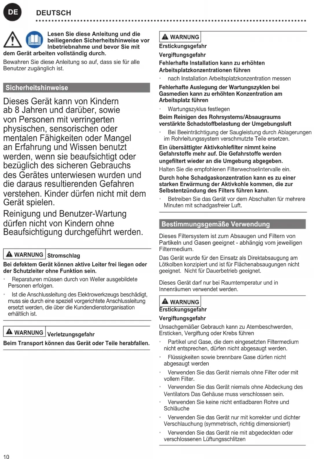 - BetreibenSiedasGerätvordemAbschaltenfürmehrere MinutenmitschadgasfreierLuft. Bestimmungsgemäße Verwendung Dieses Filtersystem ist zum Absaugen und Filtern von Partikeln und Gasen geeignet - abhängig vom jeweiligen Filtermedium. Das Gerät wurde für den Einsatz als Direktabsaugung am Lötkolben konzipiert und ist für Flächenabsaugungen nicht geeignet. Nicht für Dauerbetrieb geeignet. Dieses Gerät darf nur bei Raumtemperatur und in Innenräumen verwendet werden. WARNUNG Erstickungsgefahr Vergiftungsgefahr Unsachgemäßer Gebrauch kann zu Atembeschwerden, Ersticken, Vergiftung oder Krebs führen