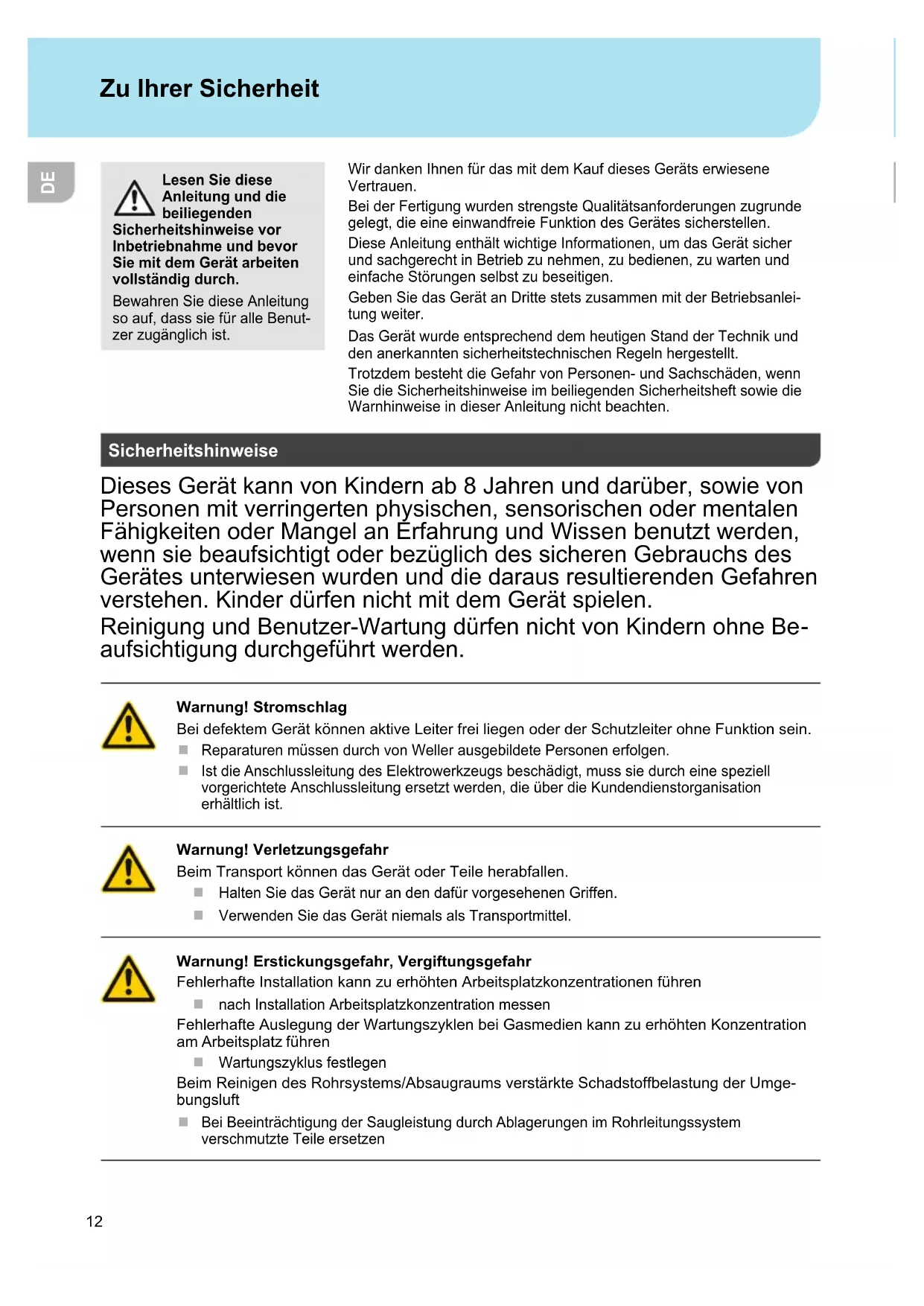 orltertufe einstaulterlasse ompaktlter Stufe 2; 3 Partikellteraslterktivkohlehemisor RS232-Schnittstelle Mit Hilfe der RS232-Schnittstelle kann die Anlage in vollem Funktionsum- fang bedient bzw. fernüberwacht werden. chnittstelle erdiechnittstelleknnenirmareupdateseinEfciencyTest und eine Daten Log Funktion durchgeführt werden. asediumdarfmaimalinuteneingestecktseinanachird dasodulautomatischageschaltet Technische Daten Garantie Die Mängelansprüche des Käufers verjähren in einem Jahr ab Ablieferung an ihn. Dies gilt nicht für ckgriffsansprchedesufersnach useinervonunsagegeenenarantiehaftenirnurenndieeschaffenheitsoderaltarkeitsgarantie vonunsschriftlichunduntererendungdesegriffsarantieagegeenordenist iearantieverfllteiunsachgememerauchundennvonunualiziertenPersonenEingriffevorge- nommen wurden. Technische Änderungen vorbehalten! Bitte informieren Sie sich unter www.weller-tools.com DE15