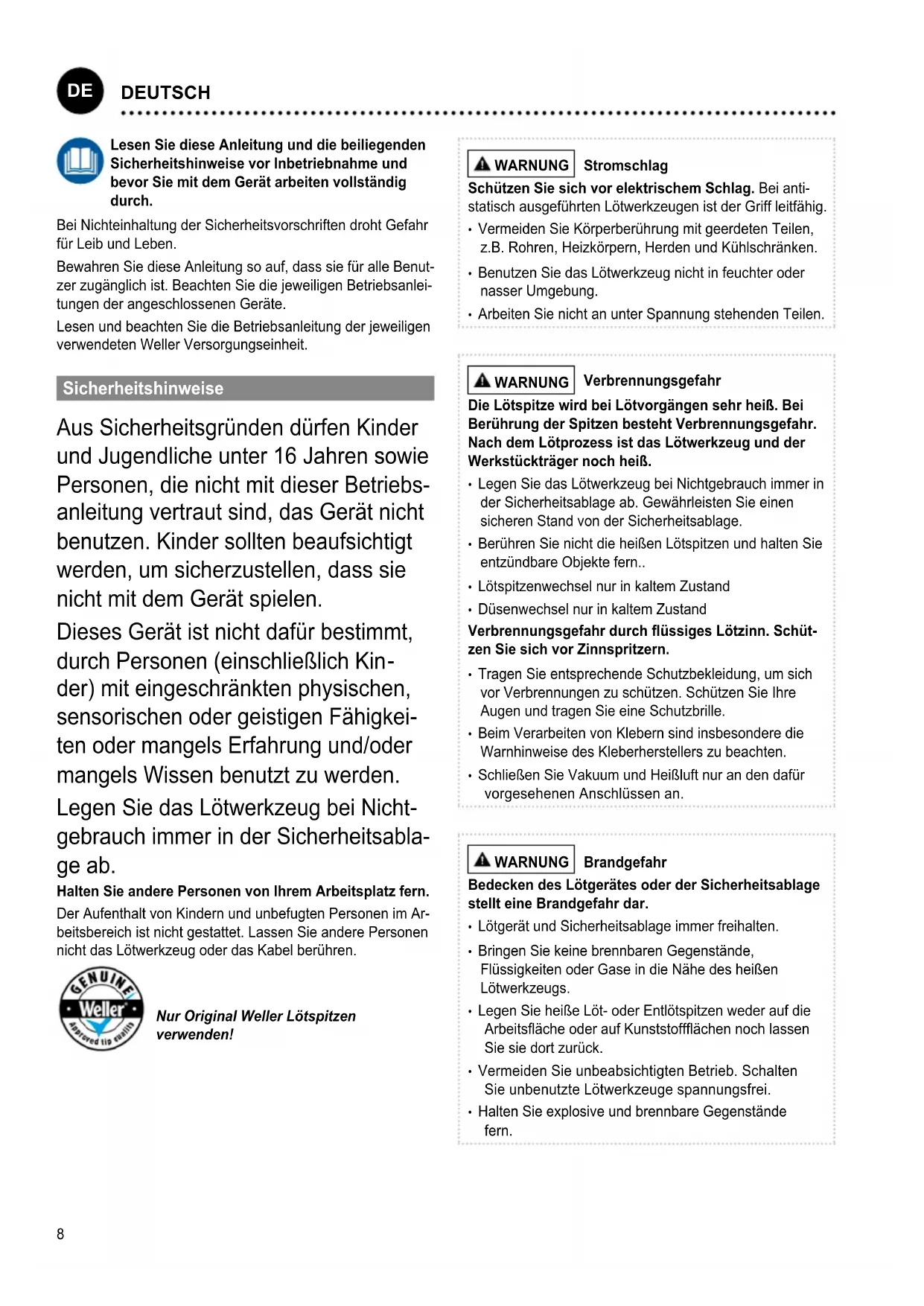 Lesen Sie diese Anleitung und die beiliegenden Sicherheitshinweise vor Inbetriebnahme und bevor Sie mit dem Gerät arbeiten vollständig durch. Bei Nichteinhaltung der Sicherheitsvorschriften droht Gefahr für Leib und Leben. Bewahren Sie diese Anleitung so auf, dass sie für alle Benut- zer zugänglich ist. Beachten Sie die jeweiligen Betriebsanlei- tungen der angeschlossenen Geräte. Lesen und beachten Sie die Betriebsanleitung der jeweiligen verwendeten Weller Versorgungseinheit. Sicherheitshinweise Aus Sicherheitsgründen dürfen Kinder und Jugendliche unter 16 Jahren sowie Personen, die nicht mit dieser Betriebs- anleitung vertraut sind, das Gerät nicht benutzen. Kinder sollten beaufsichtigt werden, um sicherzustellen, dass sie nicht mit dem Gerät spielen. Dieses Gerät ist nicht dafür bestimmt, durch Personen (einschließlich Kin
