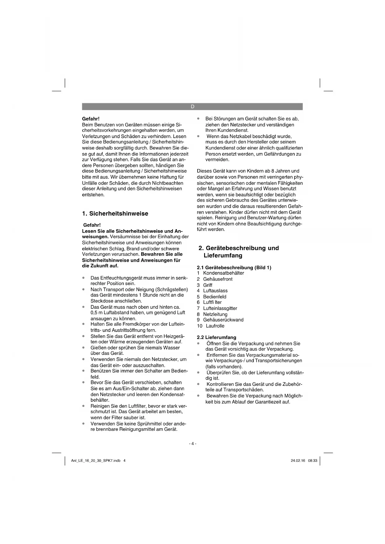Die Entfeuchterleistung des Gerätes ist ab- hängig von der räumlichen Beschaffenheit, Raumtemperatur und relativer Raumluft- feuchte. Anl_LE_16_20_30_SPK7.indb 6Anl_LE_16_20_30_SPK7.indb 6 24.02.16 08:3324.02.16 08:33D