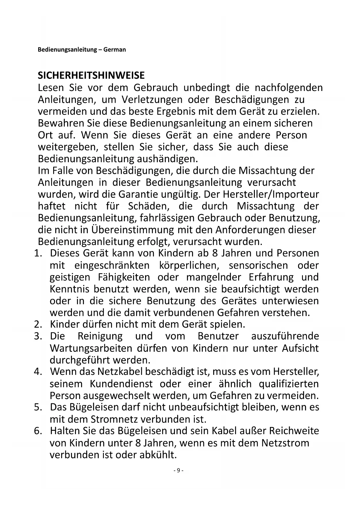 Recycling – European Directive 2012/19/EU This marking indicates that this product should not be disposed with other household wastes. To prevent possible harm to the environment or human health from uncontrolled waste disposal, recycle it responsibly to promote the sustainable reuse of material resources. To return your used device, please use the return and collection systems or contact the retailer where the product was purchased. They can take this product for environmental safe recycling.- 8 - Emerio B.V. Customer service: Kundeninformation: Klantenservice: Oudeweg 115 T: +31 (0) 23 3034369 T: +49 (0) 3222 1097 600 T: +31 (0) 23 3034369 2031 CC Haarlem www.emerio.eu/service www.emerio.eu/service www.emerio.eu/service The Netherlands Emerio Nordic AB Kundtjänst Smedjegatan 6 T. +46 8 7173450 131 54 Nacka www.emerio.eu/service Sweden- 9 - Bedienungsanleitung – German SICHERHEITSHINWEISE Lesen Sie vor dem Gebrauch unbedingt die nachfolgenden Anleitungen, um Verletzungen oder Beschädigungen zu vermeiden und das beste Ergebnis mit dem Gerät zu erzielen. Bewahren Sie diese Bedienungsanleitung an einem sicheren Ort auf. Wenn Sie dieses Gerät an eine andere Person weitergeben, stellen Sie sicher, dass Sie auch diese Bedienungsanleitung aushändigen. Im Falle von Beschädigungen, die durch die Missachtung der Anleitungen in dieser Bedienungsanleitung verursacht wurden, wird die Garantie ungültig. Der Hersteller/Importeur haftet nicht für Schäden, die durch Missachtung der Bedienungsanleitung, fahrlässigen Gebrauch oder Benutzung, die nicht in Übereinstimmung mit den Anforderungen dieser Bedienungsanleitung erfolgt, verursacht wurden.