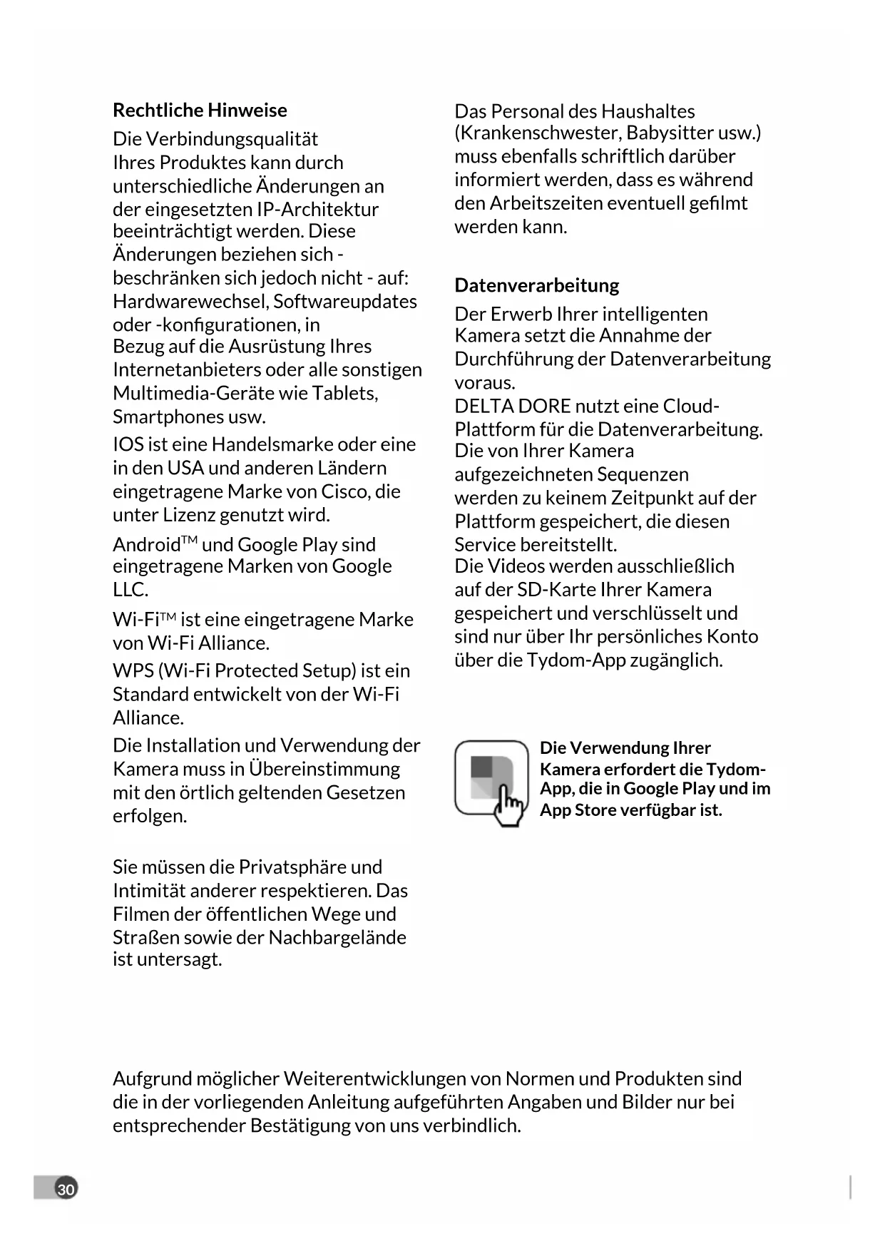 ist eine eingetragene Marke von Wi-Fi Alliance. WPS (Wi-Fi Protected Setup) ist ein Standard entwickelt von der Wi-Fi Alliance. Die Installation und Verwendung der Kamera muss in Übereinstimmung mit den örtlich geltenden Gesetzen erfolgen. Sie müssen die Privatsphäre und Intimität anderer respektieren. Das Filmen der öffentlichen Wege und Straßen sowie der Nachbargelände ist untersagt. Das Personal des Haushaltes (Krankenschwester, Babysitter usw.) muss ebenfalls schriftlich darüber informiert werden, dass es während den Arbeitszeiten eventuell gelmt werden kann. Datenverarbeitung Der Erwerb Ihrer intelligenten Kamera setzt die Annahme der Durchführung der Datenverarbeitung voraus. DELTA DORE nutzt eine Cloud- Plattform für die Datenverarbeitung. Die von Ihrer Kamera aufgezeichneten Sequenzen werden zu keinem Zeitpunkt auf der Plattform gespeichert, die diesen Service bereitstellt. Die Videos werden ausschließlich auf der SD-Karte Ihrer Kamera gespeichert und verschlüsselt und sind nur über Ihr persönliches Konto über die Tydom-App zugänglich. Die Verwendung Ihrer Kamera erfordert die Tydom- App, die in Google Play und im App Store verfügbar ist. Aufgrund möglicher Weiterentwicklungen von Normen und Produkten sind die in der vorliegenden Anleitung aufgeführten Angaben und Bilder nur bei entsprechender Bestätigung von uns verbindlich.31