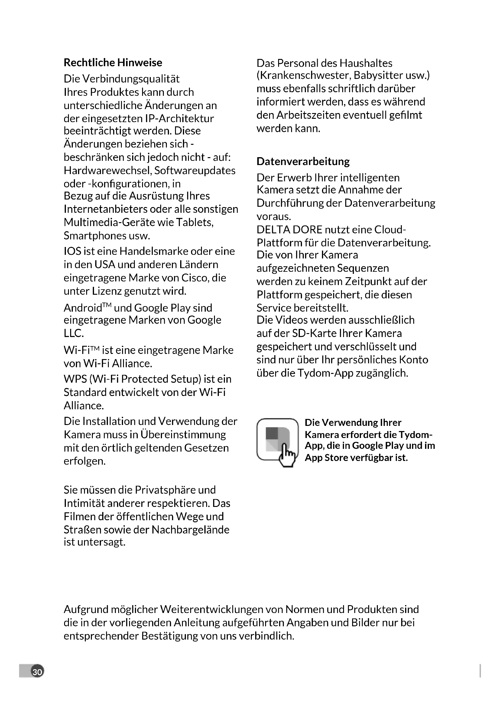 ist eine eingetragene Marke von Wi-Fi Alliance. WPS (Wi-Fi Protected Setup) ist ein Standard entwickelt von der Wi-Fi Alliance. Die Installation und Verwendung der Kamera muss in Übereinstimmung mit den örtlich geltenden Gesetzen erfolgen. Sie müssen die Privatsphäre und Intimität anderer respektieren. Das Filmen der öffentlichen Wege und Straßen sowie der Nachbargelände ist untersagt. Das Personal des Haushaltes (Krankenschwester, Babysitter usw.) muss ebenfalls schriftlich darüber informiert werden, dass es während den Arbeitszeiten eventuell gelmt werden kann. Datenverarbeitung Der Erwerb Ihrer intelligenten Kamera setzt die Annahme der Durchführung der Datenverarbeitung voraus. DELTA DORE nutzt eine Cloud- Plattform für die Datenverarbeitung. Die von Ihrer Kamera aufgezeichneten Sequenzen werden zu keinem Zeitpunkt auf der Plattform gespeichert, die diesen Service bereitstellt. Die Videos werden ausschließlich auf der SD-Karte Ihrer Kamera gespeichert und verschlüsselt und sind nur über Ihr persönliches Konto über die Tydom-App zugänglich. Die Verwendung Ihrer Kamera erfordert die Tydom- App, die in Google Play und im App Store verfügbar ist. Aufgrund möglicher Weiterentwicklungen von Normen und Produkten sind die in der vorliegenden Anleitung aufgeführten Angaben und Bilder nur bei entsprechender Bestätigung von uns verbindlich.31