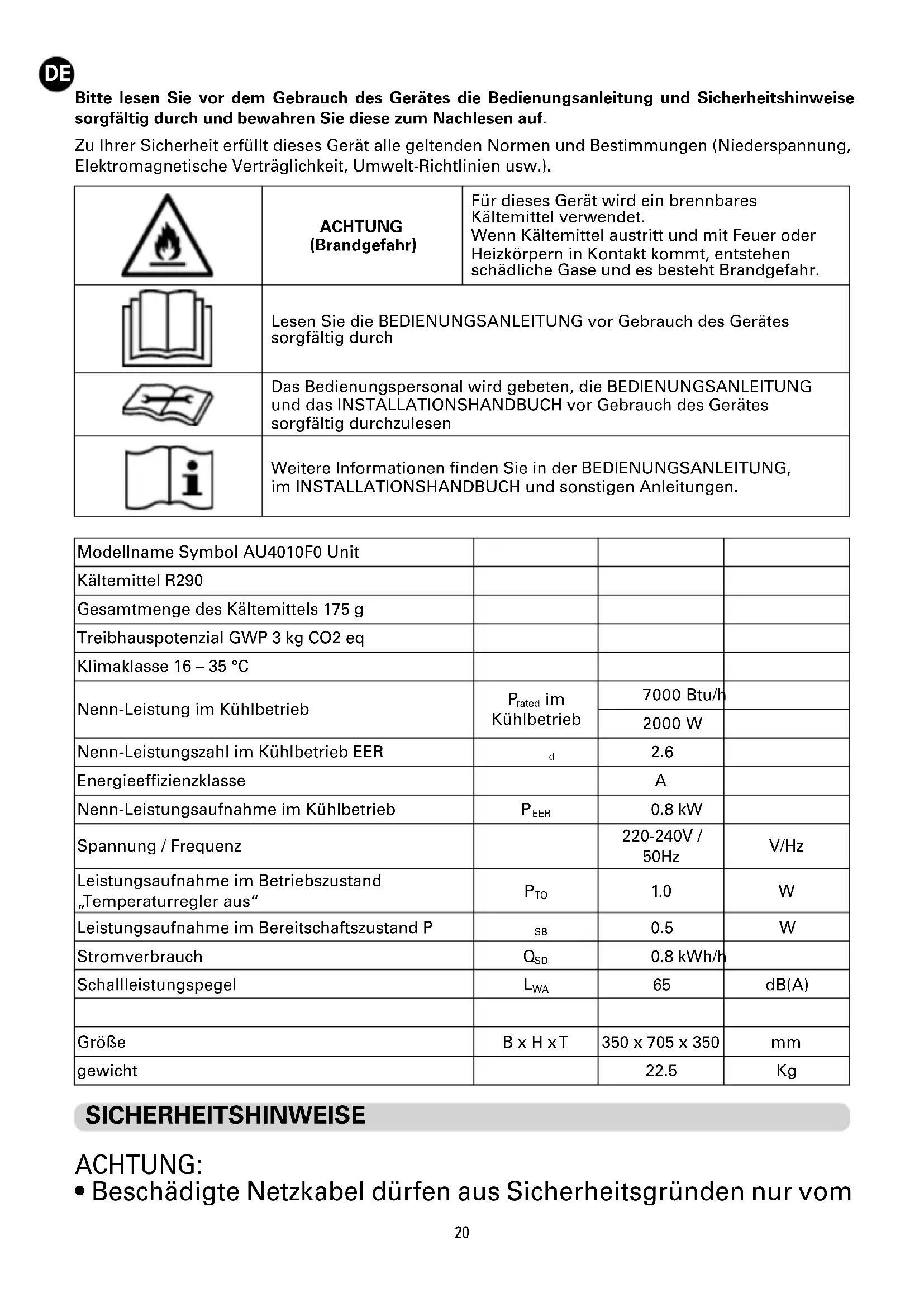 Bitte lesen Sie vor dem Gebrauch des Gerätes die Bedienungsanleitung und Sicherheitshinweise sorgfältig durch und bewahren Sie diese zum Nachlesen auf. Zu Ihrer Sicherheit erfüllt dieses Gerät alle geltenden Normen und Bestimmungen (Niederspannung, Elektromagnetische Verträglichkeit, Umwelt-Richtlinien usw.). ACHTUNG (Brandgefahr) Für dieses Gerät wird ein brennbares Kältemittel verwendet. Wenn Kältemittel austritt und mit Feuer oder Heizkörpern in Kontakt kommt, entstehen schädliche Gase und es besteht Brandgefahr. Lesen Sie die BEDIENUNGSANLEITUNG vor Gebrauch des Gerätes sorgfältig durch Das Bedienungspersonal wird gebeten, die BEDIENUNGSANLEITUNG und das INSTALLATIONSHANDBUCH vor Gebrauch des Gerätes sorgfältig durchzulesen Weitere Informationen finden Sie in der BEDIENUNGSANLEITUNG, im INSTALLATIONSHANDBUCH und sonstigen Anleitungen. Modellname Symbol AU4010F0 Unit Kältemittel R290 Gesamtmenge des Kältemittels 175 g Treibhauspotenzial GWP 3 kg CO2 eq Klimaklasse 16 – 35 °C Nenn-Leistung im Kühlbetrieb