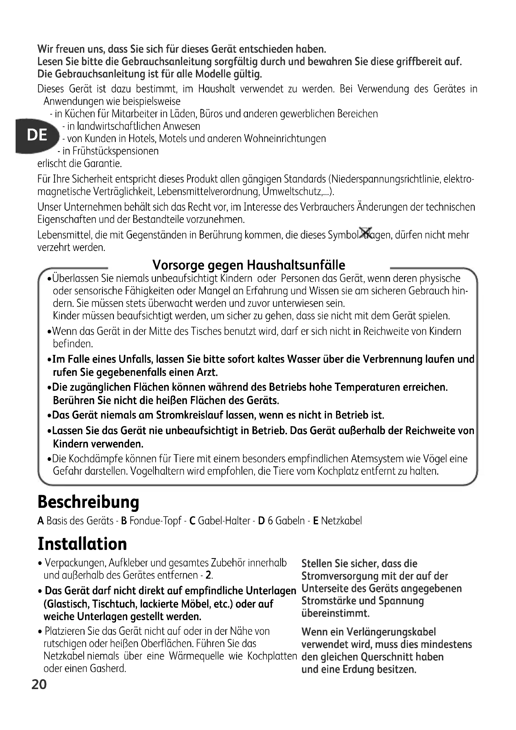 - Platzieren Sie das Gerät nicht auf oder in der Nähe von rutschigen oder heißen Oberflächen. Führen Sie das Netzkabel niemals über eine Wärmequelle wie Kochplatten oder einen Gasherd. Installation Stellen Sie sicher, dass die Stromversorgung mit der auf der Unterseite des Geräts angegebenen Stromstärke und Spannung übereinstimmt. Wenn ein Verlängerungskabel verwendet wird, muss dies mindestens den gleichen Querschnitt haben und eine Erdung besitzen. A Basis des Geräts - B Fondue-Topf - C Gabel-Halter - D 6 Gabeln - E Netzkabel Beschreibung Wir freuen uns, dass Sie sich für dieses Gerät entschieden haben. Lesen Sie bitte die Gebrauchsanleitung sorgfältig durch und bewahren Sie diese griffbereit auf. Die Gebrauchsanleitung ist für alle Modelle gültig. Dieses Gerät ist dazu bestimmt, im Haushalt verwendet zu werden. Bei Verwendung des Gerätes in Anwendungen wie beispielsweise - in Küchen für Mitarbeiter in Läden, Büros und anderen gewerblichen Bereichen - in landwirtschaftlichen Anwesen - von Kunden in Hotels, Motels und anderen Wohneinrichtungen - in Frühstückspensionen erlischt die Garantie. Für Ihre Sicherheit entspricht dieses Produkt allen gängigen Standards (Niederspannungsrichtlinie, elektro- magnetische Verträglichkeit, Lebensmittelverordnung, Umweltschutz,...). Unser Unternehmen behält sich das Recht vor, im Interesse des Verbrauchers Änderungen der technischen Eigenschaften und der Bestandteile vorzunehmen. Lebensmittel, die mit Gegenständen in Berührung kommen, die dieses Symbol tragen, dürfen nicht mehr verzehrt werden.