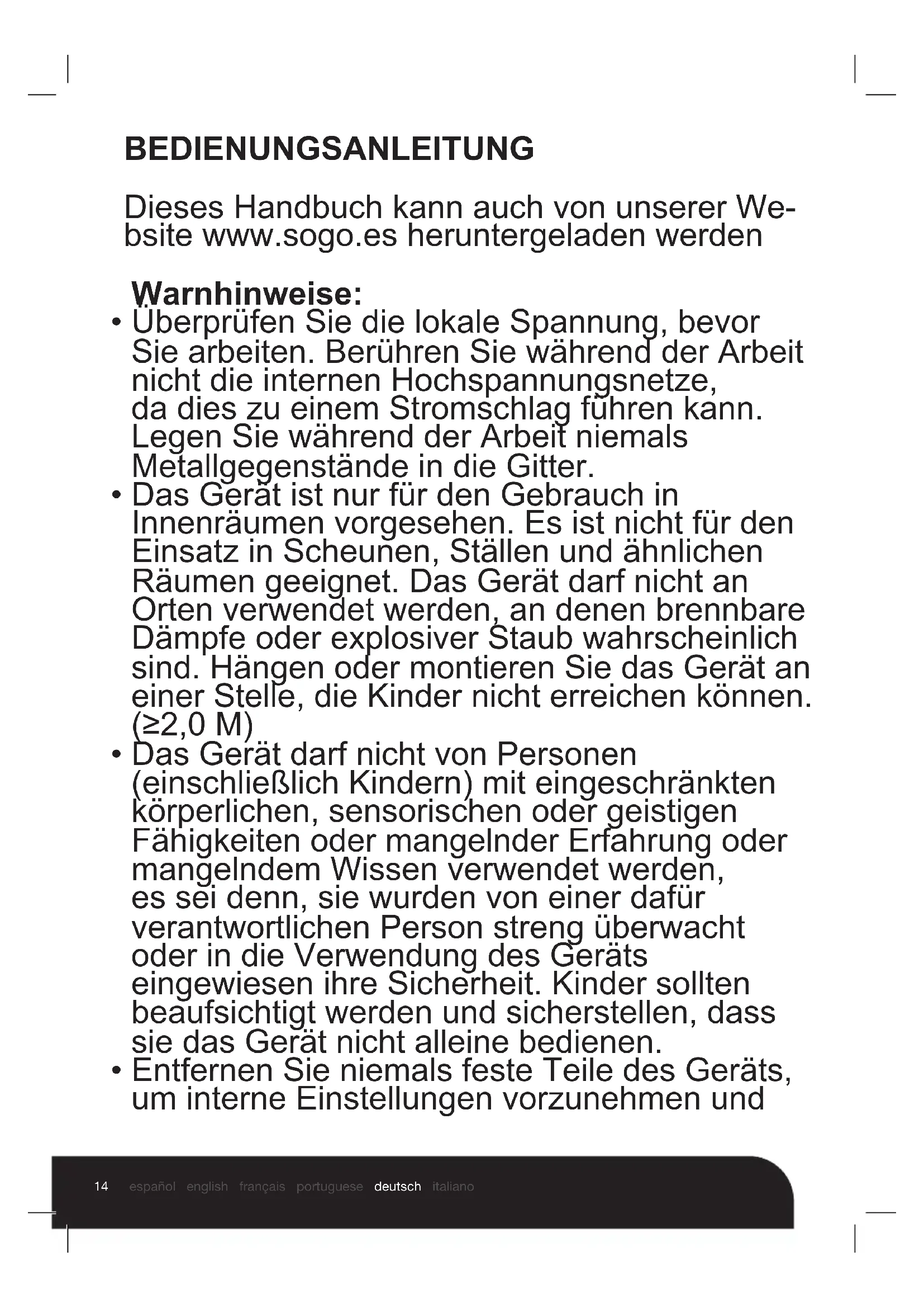 Tensão nominal: 220V-240V~50/60 Hz Modelo: SS-13905 Frequência nominal: 50/60Hz14 español english français portuguese deutsch italiano BEDIENUNGSANLEITUNG Dieses Handbuch kann auch von unserer We- bsite www.sogo.es heruntergeladen werden Warnhinweise: