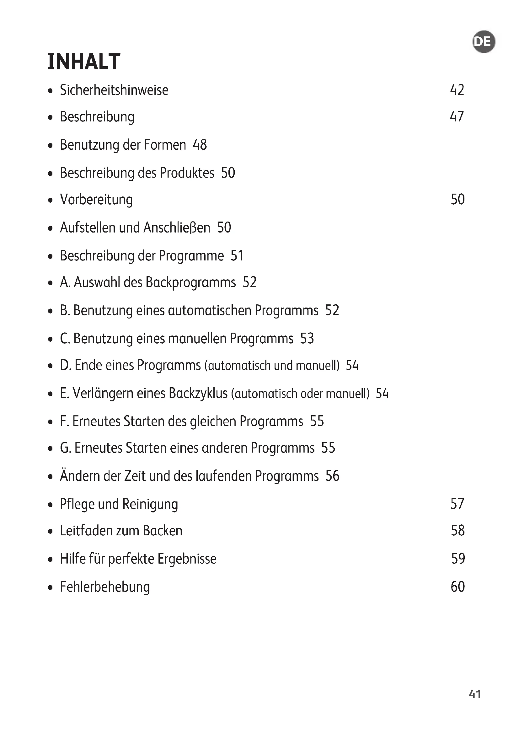 DEFehlerbehebung Problem Lösung Er00 oder Er003 Geräteausfall: Ziehen Sie den Stecker des Gerätes und wenden Sie sich an Ihren Kundendienst oder eine Reparaturwerkstatt. Er01/Er02/Er04/Er05/Er06 Ziehen Sie den Stecker des Gerätes und warten Sie einige Minuten. Verbinden Sie Ihr Gerät wieder mit der Steckdose und schalten Sie es ein. Wenn das Problem weiterhin besteht, wenden Sie sich an Ihren Kundendienst oder eine Reparaturwerkstatt. Die angezeigte Zeit blinkt. Wenn die angezeigte Zeit richtig ist, drücken Sie OK zur Bestätigung. Die angezeigte Temperatur blinkt. Wenn die angezeigte Temperatur richtig ist, drücken Sie OK zur Bestätigung. Das aufleuchtende Programm blinkt. Wenn das angezeigte Programm richtig ist, drücken Sie OK zur Bestätigung. Das Gerät lässt sich nicht ordnungsgemäß schließen. Öffnen Sie das Gerät und prüfen Sie, ob der Backrost möglicherweise unter der Antihaft-Backform vergessen wurde. Prüfen Sie, ob Sie eine Silikonform benutzen, die höher als 4,5 cm ist. Entfernen Sie in diesem Fall den Backrost. Die verwendete Form ist nicht für dieses Gerät geeignet: Benutzen Sie eine Form, die mit den Benutzungsbedingungen dieses Gerätes übereinstimmt. Die Zeit hat 000 erreicht, aber das Backergebnis ist nicht zufriedenstellend. Schließen Sie am Ende des Backvorgangs, nachdem Sie den Klingelton durch einmaliges Drücken von OK ausgeschaltet haben, das Gerät wieder und verlängern Sie die Zeit mithilfe der - und + Tasten. Bestätigen Sie dann durch Drücken von OK. Nach dem Ändern der Backzeit stellt sich die Backzeit während des Backvorgangs automatisch auf die ursprüngliche Zeit zurück. Drücken Sie nach dem Ändern der Zeit OK zur Bestätigung. Nach dem Starten eines Backprogramms ist es nicht möglich, die Backzeit zu ändern. Warten Sie, bis 2 Minuten nach dem Start des Programms abgelaufen sind, bevor Sie die Zeit mithilfe der - und + Tasten ändern.