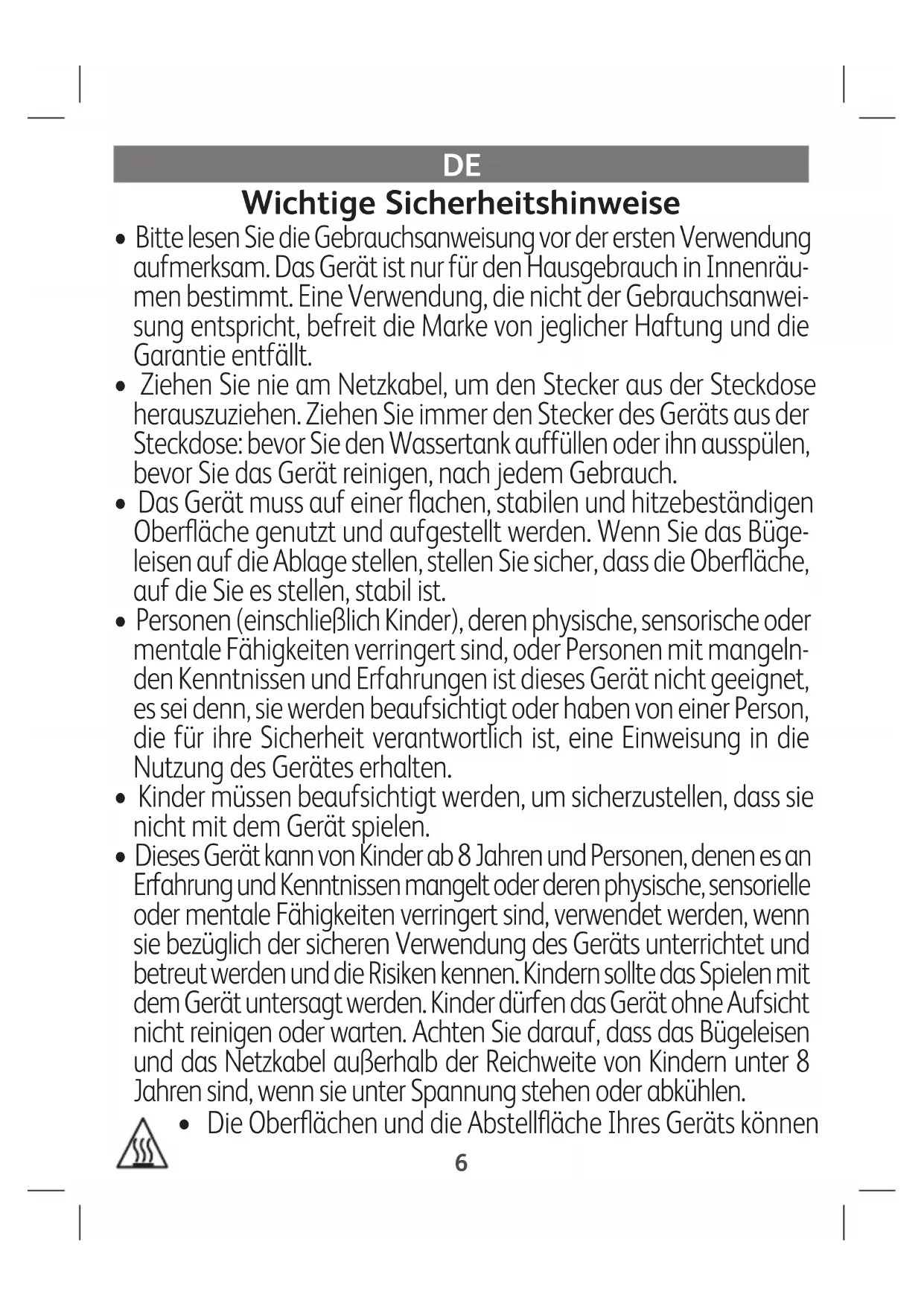 - Dieses Gerät kann von Kinder ab 8 Jahren und Personen, denen es an Erfahrung und Kenntnissen mangelt oder deren physische, sensorielle oder mentale Fähigkeiten verringert sind, verwendet werden, wenn sie bezüglich der sicheren Verwendung des Geräts unterrichtet und betreut werden und die Risiken kennen. Kindern sollte das Spielen mit dem Gerät untersagt werden. Kinder dürfen das Gerät ohne Aufsicht nicht reinigen oder warten. Achten Sie darauf, dass das Bügeleisen und das Netzkabel außerhalb der Reichweite von Kindern unter 8 Jahren sind, wenn sie unter Spannung stehen oder abkühlen.