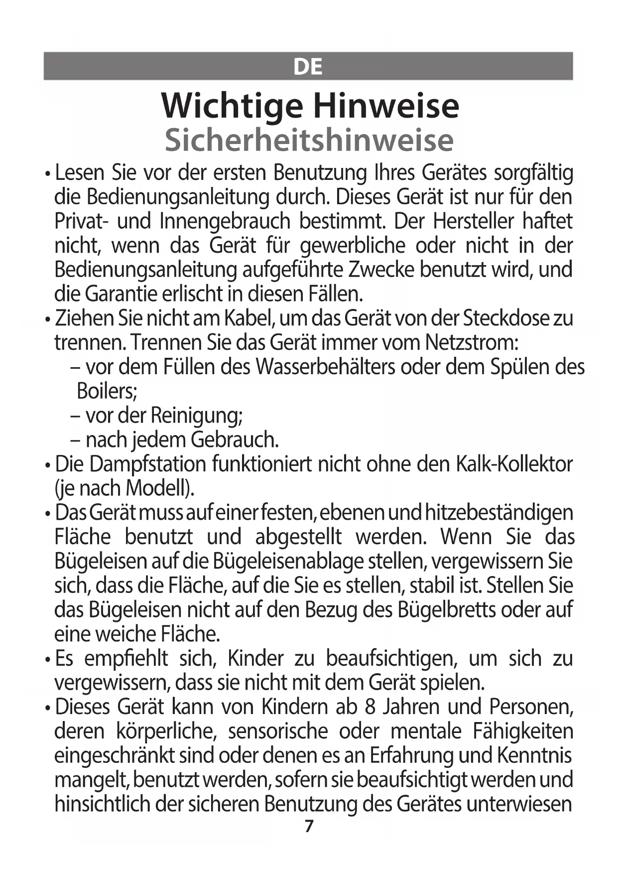 - Dieses Gerät kann von Kindern ab 8 Jahren und Personen, deren körperliche, sensorische oder mentale Fähigkeiten eingeschränkt sind oder denen es an Erfahrung und Kenntnis mangelt, benutzt werden, sofern sie beaufsichtigt werden und hinsichtlich der sicheren Benutzung des Gerätes unterwiesen8 wurden und die damit verbundenen Risiken kennen. Kinder dürfen nicht mit dem Gerät spielen. Kinder dürfen das Gerät nur unter Aufsicht reinigen oder warten. Das Bügeleisen und sein Stromkabel müssen immer außer Reichweite von Kindern unter 8 Jahren gehalten werden, wenn das Gerät mit dem Netzstrom verbunden ist oder während es abkühlt.