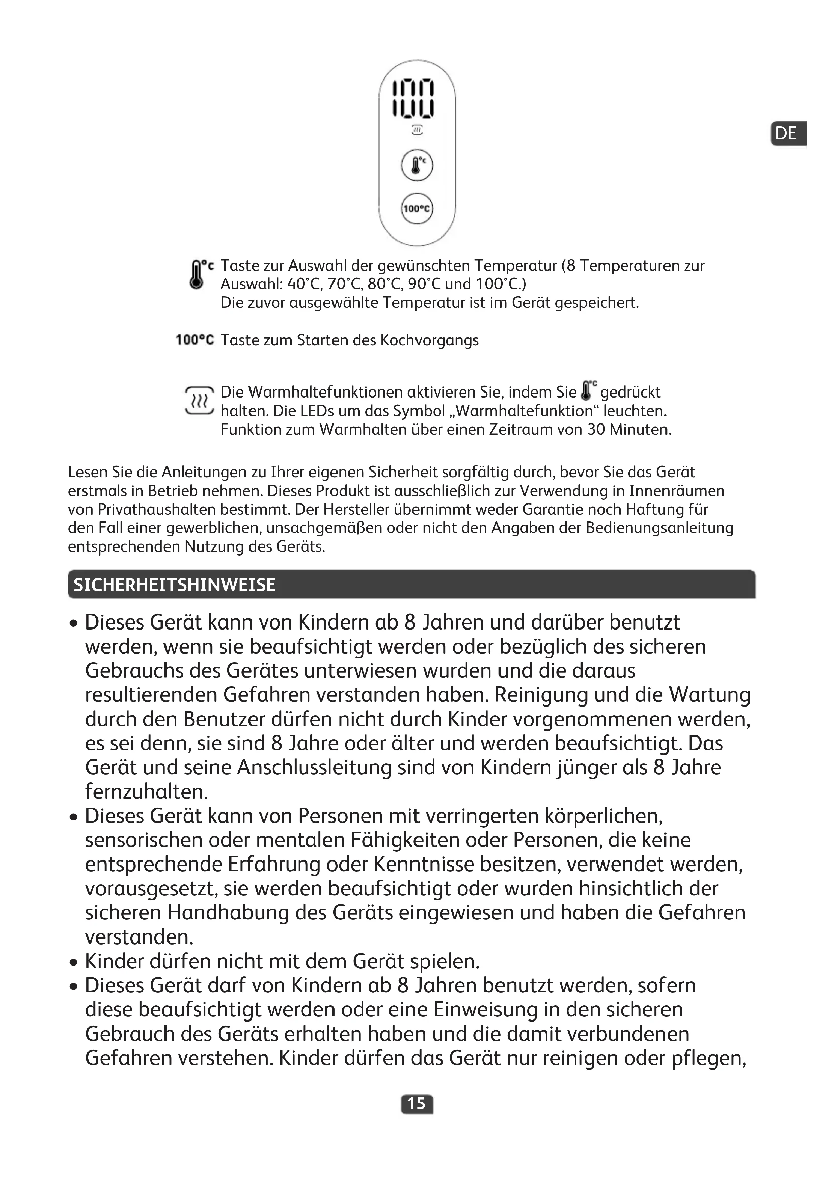 Taste zur Auswahl der gewünschten Temperatur (8 Temperaturen zur Auswahl: 40°C, 70°C, 80°C, 90°C und 100°C.) Die zuvor ausgewählte Temperatur ist im Gerät gespeichert. Taste zum Starten des Kochvorgangs Die Warmhaltefunktionen aktivieren Sie, indem Sie gedrückt halten. Die LEDs um das Symbol „Warmhaltefunktion“ leuchten. Funktion zum Warmhalten über einen Zeitraum von 30 Minuten. Lesen Sie die Anleitungen zu Ihrer eigenen Sicherheit sorgfältig durch, bevor Sie das Gerät erstmals in Betrieb nehmen. Dieses Produkt ist ausschließlich zur Verwendung in Innenräumen von Privathaushalten bestimmt. Der Hersteller übernimmt weder Garantie noch Haftung für den Fall einer gewerblichen, unsachgemäßen oder nicht den Angaben der Bedienungsanleitung entsprechenden Nutzung des Geräts.16 wenn siemindestens 8Jahre alt sind und von einem Erwachsenen beaufsichtigt werden.