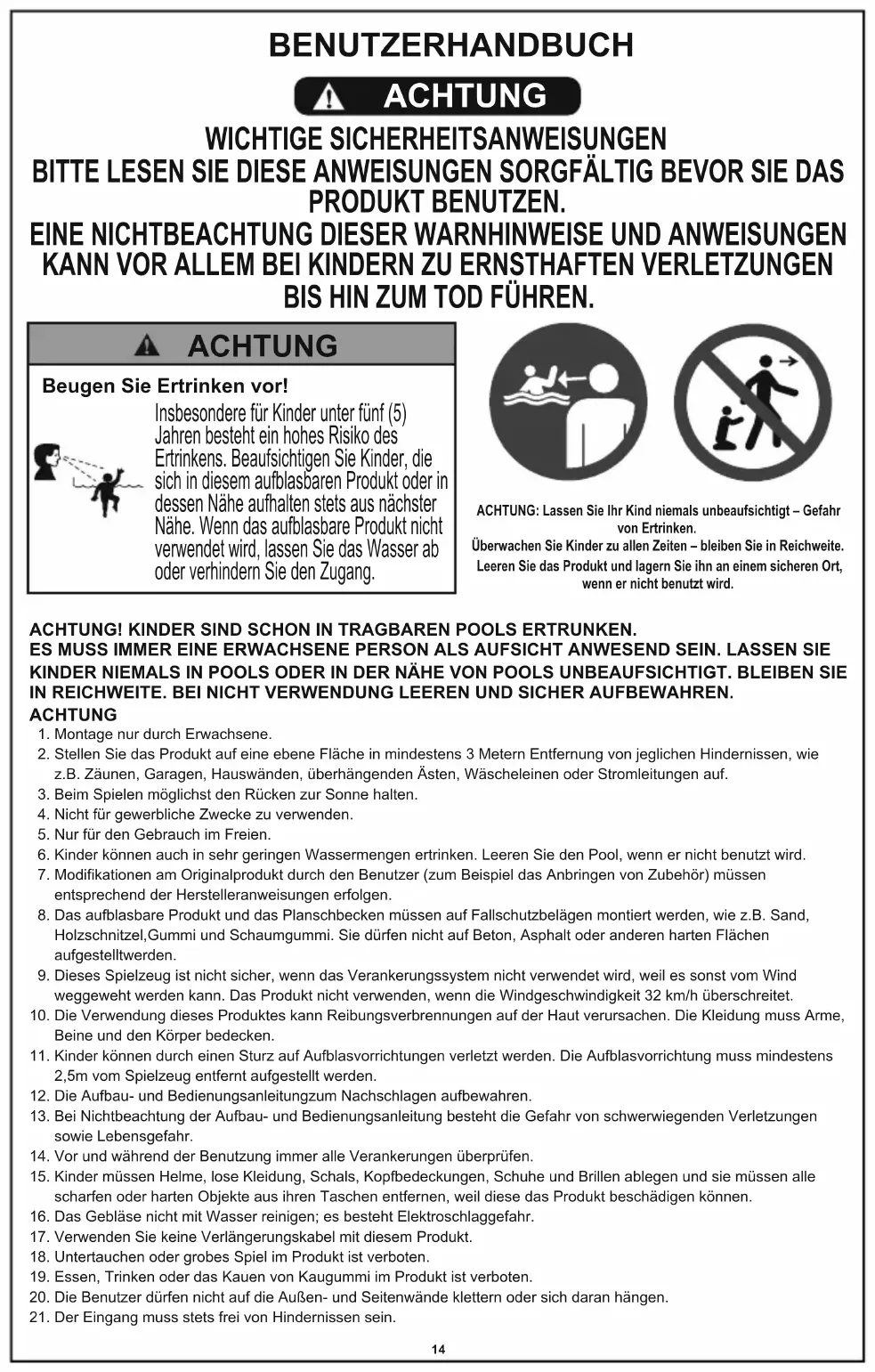 KANN VOR ALLEM BEI KINDERN ZU ERNSTHAFTEN VERLETZUNGEN BIS HIN ZUM TOD FÜHREN. Beugen Sie Ertrinken vor! Insbesondere für Kinder unter fünf (5) Jahren besteht ein hohes Risiko des Ertrinkens. Beaufsichtigen Sie Kinder, die sich in diesem aufblasbaren Produkt oder in dessen Nähe aufhalten stets aus nächster Nähe. Wenn das aufblasbare Produkt nicht verwendet wird, lassen Sie das Wasser ab oder verhindern Sie den Zugang. ACHTUNG ACHTUNG: Lassen Sie Ihr Kind niemals unbeaufsichtigt – Gefahr von Ertrinken.Überwachen Sie Kinder zu allen Zeiten – bleiben Sie in Reichweite.Leeren Sie das Produkt und lagern Sie ihn an einem sicheren Ort, wenn er nicht benutzt wird.ACHTUNG! KINDER SIND SCHON IN TRAGBAREN POOLS ERTRUNKEN.ES MUSS IMMER EINE ERWACHSENE PERSON ALS AUFSICHT ANWESEND SEIN. LASSEN SIE KINDER NIEMALS IN POOLS ODER IN DER NÄHE VON POOLS UNBEAUFSICHTIGT. BLEIBEN SIE IN REICHWEITE. BEI NICHT VERWENDUNG LEEREN UND SICHER AUFBEWAHREN.ACHTUNG 1. Montage nur durch Erwachsene. 2. Stellen Sie das Produkt auf eine ebene Fläche in mindestens 3 Metern Entfernung von jeglichen Hindernissen, wie z.B. Zäunen, Garagen, Hauswänden, überhängenden Ästen, Wäscheleinen oder Stromleitungen auf. 3. Beim Spielen möglichst den Rücken zur Sonne halten. 4. Nicht für gewerbliche Zwecke zu verwenden. 5. Nur für den Gebrauch im Freien. 6. Kinder können auch in sehr geringen Wassermengen ertrinken. Leeren Sie den Pool, wenn er nicht benutzt wird. 7. Modifikationen am Originalprodukt durch den Benutzer (zum Beispiel das Anbringen von Zubehör) müssen entsprechend der Herstelleranweisungen erfolgen. 8. Das aufblasbare Produkt und das Planschbecken müssen auf Fallschutzbelägen montiert werden, wie z.B. Sand, Holzschnitzel,Gummi und Schaumgummi. Sie dürfen nicht auf Beton, Asphalt oder anderen harten Flächen aufgestelltwerden. 9. Dieses Spielzeug ist nicht sicher, wenn das Verankerungssystem nicht verwendet wird, weil es sonst vom Wind weggeweht werden kann. Das Produkt nicht verwenden, wenn die Windgeschwindigkeit 32 km/h überschreitet.10. Die Verwendung dieses Produktes kann Reibungsverbrennungen auf der Haut verursachen. Die Kleidung muss Arme, Beine und den Körper bedecken.11. Kinder können durch einen Sturz auf Aufblasvorrichtungen verletzt werden. Die Aufblasvorrichtung muss mindestens 2,5m vom Spielzeug entfernt aufgestellt werden.12. Die Aufbau- und Bedienungsanleitungzum Nachschlagen aufbewahren.13. Bei Nichtbeachtung der Aufbau- und Bedienungsanleitung besteht die Gefahr von schwerwiegenden Verletzungen sowie Lebensgefahr.14. Vor und während der Benutzung immer alle Verankerungen überprüfen.15. Kinder müssen Helme, lose Kleidung, Schals, Kopfbedeckungen, Schuhe und Brillen ablegen und sie müssen alle scharfen oder harten Objekte aus ihren Taschen entfernen, weil diese das Produkt beschädigen können.16. Das Gebläse nicht mit Wasser reinigen; es besteht Elektroschlaggefahr.17. Verwenden Sie keine Verlängerungskabel mit diesem Produkt.18. Untertauchen oder grobes Spiel im Produkt ist verboten.19. Essen, Trinken oder das Kauen von Kaugummi im Produkt ist verboten.20. Die Benutzer dürfen nicht auf die Außen- und Seitenwände klettern oder sich daran hängen.21. Der Eingang muss stets frei von Hindernissen sein. WICHTIG: Lassen Sie das gesamte Wasser aus dem Park ab, um Schimmelbildung und Stockflecken zu vermeiden. Das Produkt mussvor der Einlagerung vollständig trocken sein. Den feuchten Wasserpark niemals zusammenfalten und einlagern. WICHTIG: Alle Kinder müssen den Wasserpark vor dem Belüften/Entleeren sowie Ablassen des Wassers verlassen haben.