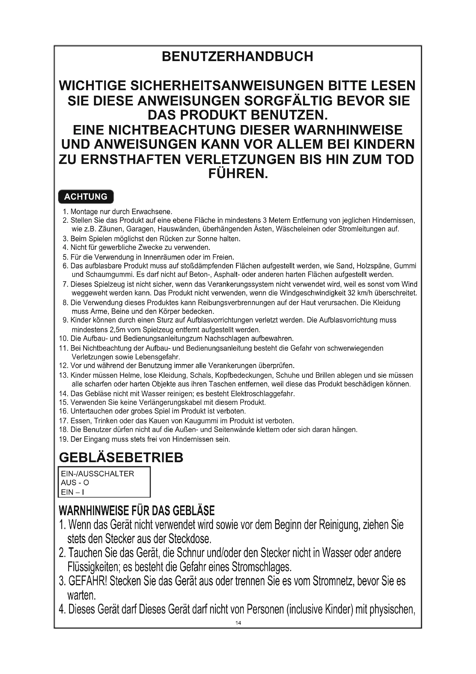 UND ANWEISUNGEN KANN VOR ALLEM BEI KINDERN ZU ERNSTHAFTEN VERLETZUNGEN BIS HIN ZUM TOD FÜHREN.