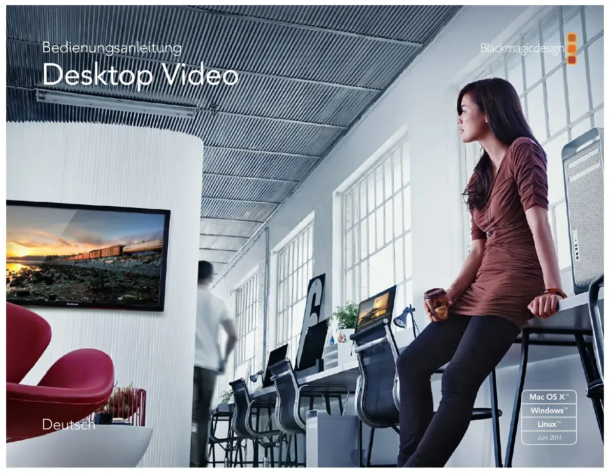 -Port. Windows Desktop Video läuft ausschließlich unter 64-Bit-Versionen von Windows, bei denen der aktuellste Service Pack installiert ist. Windows 7 und Windows 8 werden ebenfalls unterstützt. Bei Anschluss Ihrer Blackmagic Videohardware an Ihren Computer über Thunderbolt brauchen Sie einen Intel-based PC mit Thunderbolt-Port. Bei Anschluss Ihrer Blackmagic Videohardware an Ihren Computer über USB 3.0 ist ein USB-3.0-Port mit einem Renesas- Chipsatz erforderlich. Linux Desktop Video läuft auf x86-Computern mit 32-Bit und 64-Bit unter Linux 2.6.23 oder höher. Bitte sehen Sie in den Versionshinweisen nach der aktuellsten Liste unterstützter Linux-Distributionen, Paketformaten und Software-Abhängigkeiten. Erste SchritteErste Schritte