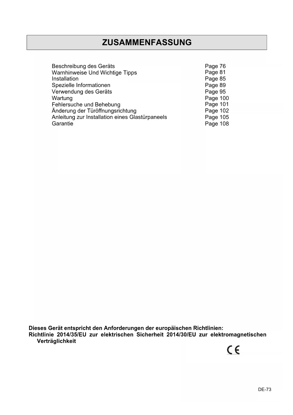 ES-71Le Chai BEDIENUNGSANLEITUNG ERRICHTET WEINKELLER LM78/1 & LMN78/1 – 7 Flaschen max LB160/1 & LBN160/1 – 16 Flaschen max LB340/1 & LBN340/1 – 35 Flaschen max LB720V/1 & LBN720V/1 – 73 Flaschen max LBN458PO/1 & LBN458POP/1 – 45 Flaschen max LBN240POV/1 & LBN240POVP/1 – 26 Flaschen max LBN460POV/1 & LBN460POVP/1 – 50 Flaschen maxZUSAMMENFASSUNG Page 76 Page 81 Page 85 Page 89 Page 95 Page 100 Page 101 Page 102 Page 105 Page 108 Beschreibung des Geräts Warnhinweise Und Wichtige Tipps Installation Spezielle Informationen Verwendung des Geräts Wartung Fehlersuche und Behebung Änderung der Türöffnungsrichtung Anleitung zur Installation eines Glastürpaneels Garantie Dieses Gerät entspricht den Anforderungen der europäischen Richtlinien: Richtlinie 2014/35/EU zur elektrischen Sicherheit 2014/30/EU zur elektromagnetischen Verträglichkeit