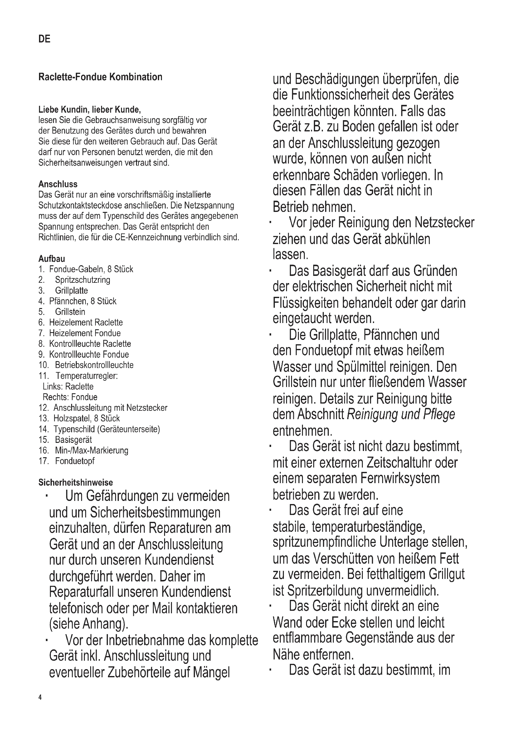 142 x 208 mm Raclette-Fondue Kombination Liebe Kundin, lieber Kunde, lesen Sie die Gebrauchsanweisung sorgfältig vor der Benutzung des Gerätes durch und bewahren Sie diese für den weiteren Gebrauch auf. Das Gerät darf nur von Personen benutzt werden, die mit den Sicherheitsanweisungen vertraut sind. Anschluss Das Gerät nur an eine vorschriftsmäßig installierte Schutzkontaktsteckdose anschließen. Die Netzspannung muss der auf dem Typenschild des Gerätes angegebenen Spannung entsprechen. Das Gerät entspricht den Richtlinien, die für die CE-Kennzeichnung verbindlich sind. Aufbau