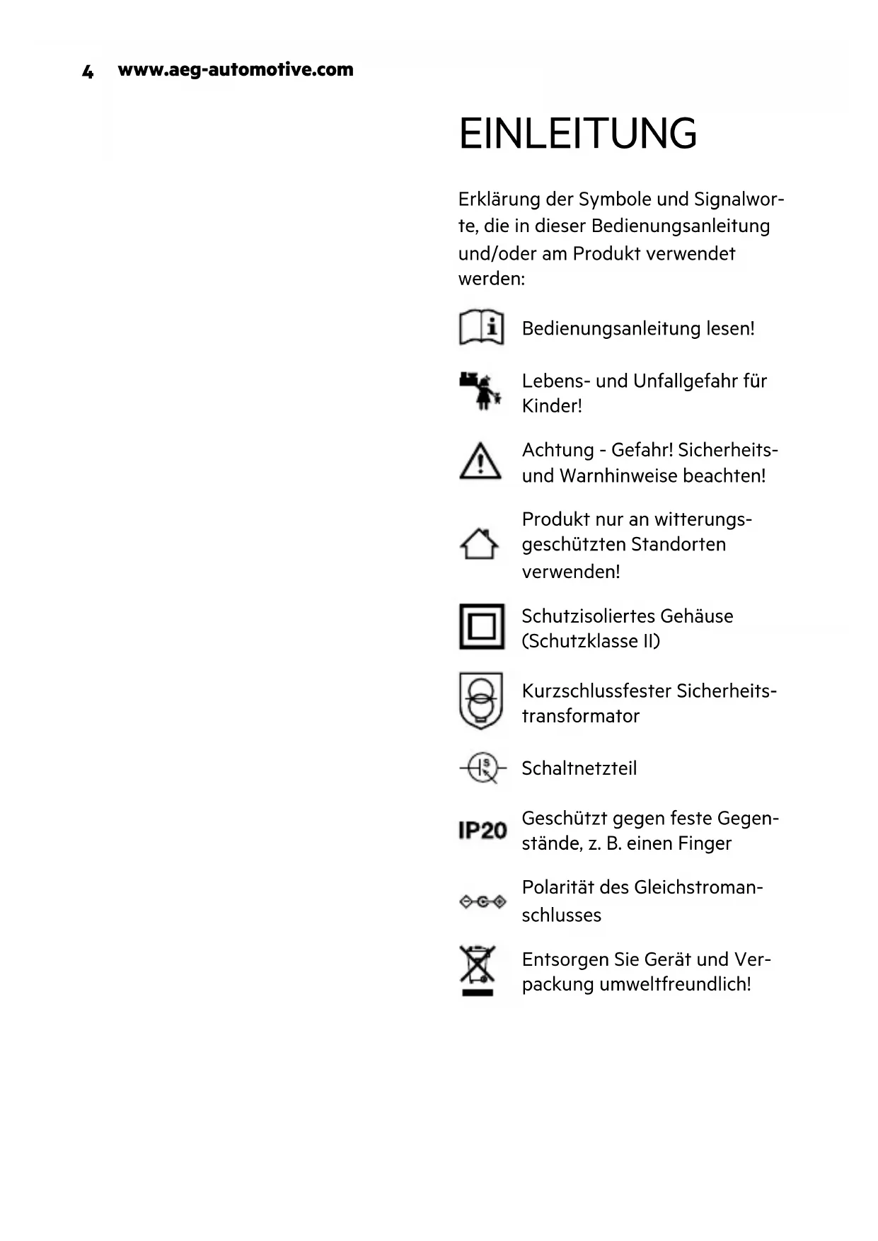 Bedienungsanleitung Geben Sie alle Unterlagen auch an andere Benutzer weiter! Technische Daten Modell KA 6 Artikel-Nr. 10698 Eingangs- spannung 100-240 V AC; 50/60 Hz Eingangs- strom max. 1,8 A Ausgangs- spannung 12 V DC Ausgangs- strom 6,0 A Schutzklasse II Gehäuse- schutz IP20www.aeg-automotive.com