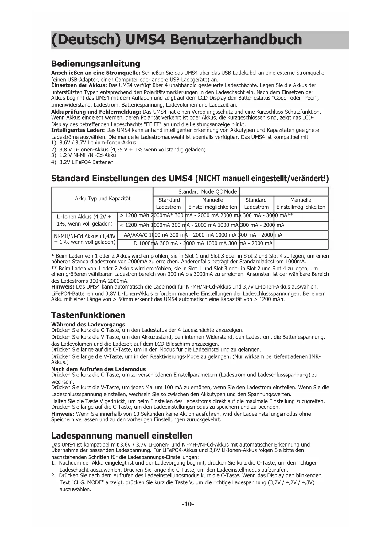 Standard Einstellungen des UMS4 (NICHT manuell eingestellt/verändert!) Akku Typ und Kapazität Standard Mode QC Mode Standard Ladestrom Manuelle Einstellmöglichkeiten Standard Ladestrom Manuelle Einstellmöglichkeiten Li-Ionen Akkus (4,2V ± 1%, wenn voll geladen) > 1200 mAh 2000mA* 300 mA - 2000 mA 2000 mA 300 mA - 3000 mA** < 1200 mAh 1000mA 300 mA - 2000 mA 1000 mA 300 mA - 2000 mA Ni-MH/Ni-Cd Akkus (1,48V ± 1%, wenn voll geladen) AA/AAA/C 1000mA 300 mA - 2000 mA 1000 mA 300 mA - 2000 mA D 1000mA 300 mA - 2000 mA 1000 mA 300 mA - 2000 mA