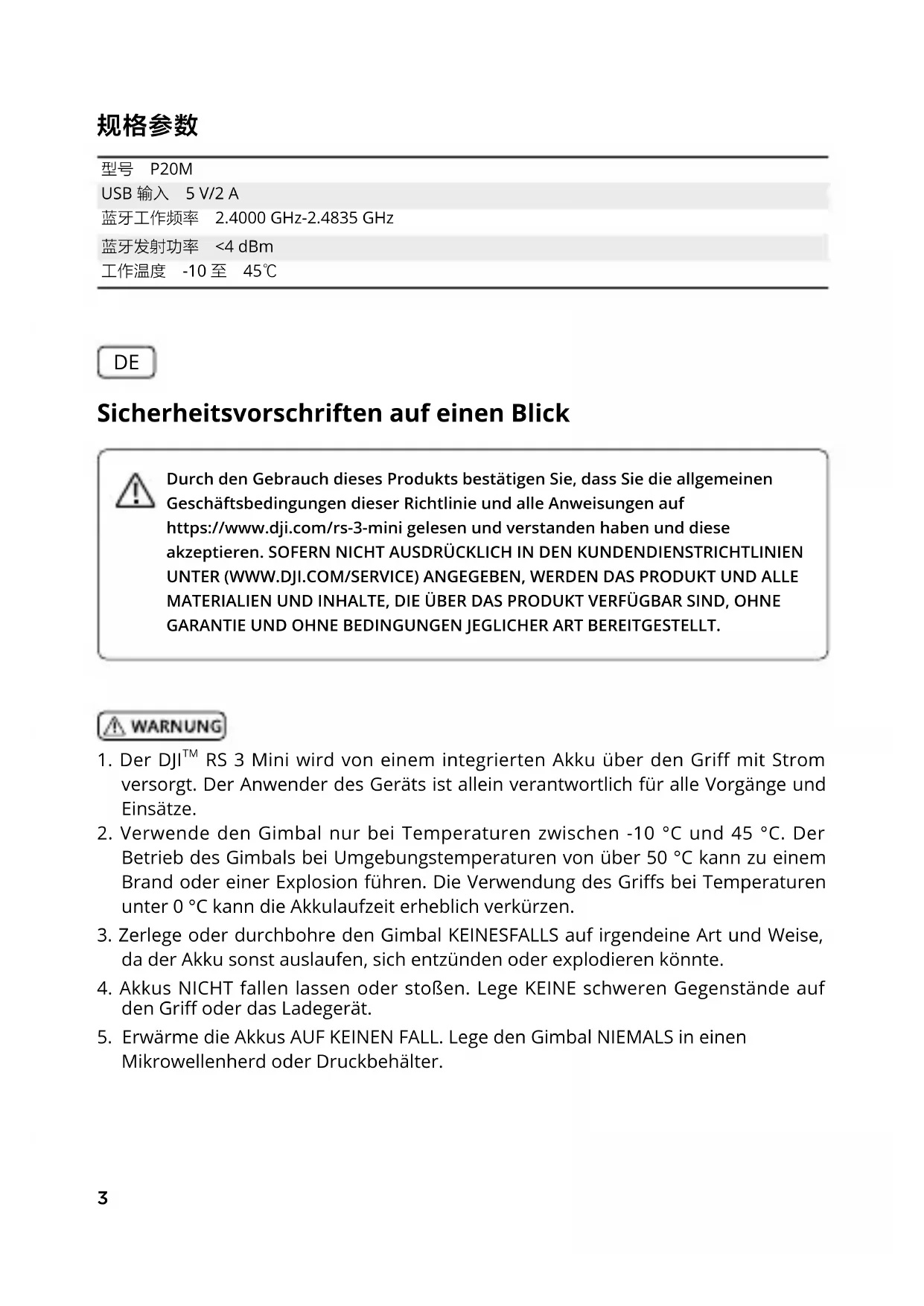 CHS3 Sicherheitsvorschriften auf einen Blick Durch den Gebrauch dieses Produkts bestätigen Sie, dass Sie die allgemeinen Geschäftsbedingungen dieser Richtlinie und alle Anweisungen auf https://www.dji.com/rs-3-mini gelesen und verstanden haben und diese akzeptieren. SOFERN NICHT AUSDRÜCKLICH IN DEN KUNDENDIENSTRICHTLINIEN UNTER (WWW.DJI.COM/SERVICE) ANGEGEBEN, WERDEN DAS PRODUKT UND ALLE MATERIALIEN UND INHALTE, DIE ÜBER DAS PRODUKT VERFÜGBAR SIND, OHNE GARANTIE UND OHNE BEDINGUNGEN JEGLICHER ART BEREITGESTELLT.