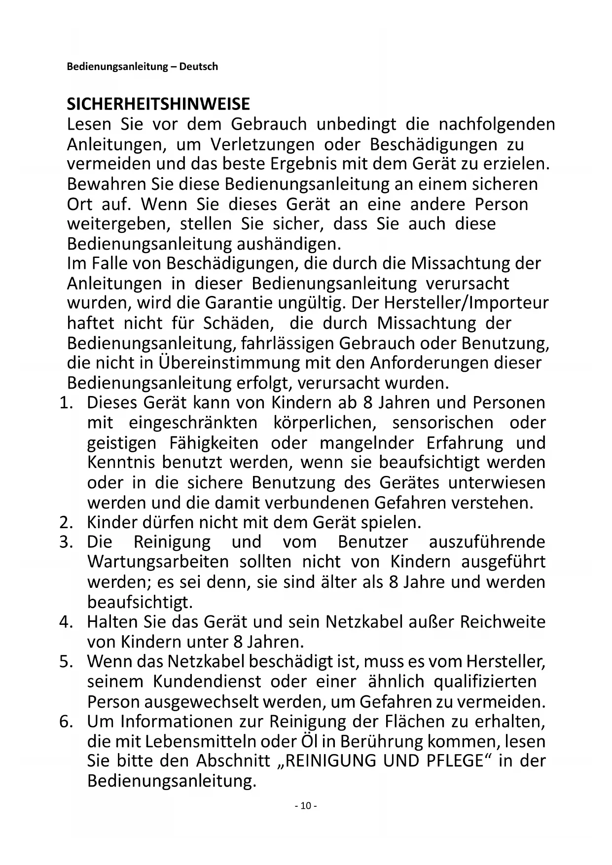 Recycling – European Directive 2012/19/EU This marking indicates that this product should not be disposed with other household wastes. To prevent possible harm to the environment or human health from uncontrolled waste disposal, recycle it responsibly to promote the sustainable reuse of material resources. To return your used device, please use the return and collection systems or contact the retailer where the product was purchased. They can take this product for environmentally safe recycling. LIPO Einrichtungsmärkte AG, Rüti Center, Rütiweg 7, CH-4133 Pratteln- 10 - Bedienungsanleitung – Deutsch SICHERHEITSHINWEISE Lesen Sie vor dem Gebrauch unbedingt die nachfolgenden Anleitungen, um Verletzungen oder Beschädigungen zu vermeiden und das beste Ergebnis mit dem Gerät zu erzielen. Bewahren Sie diese Bedienungsanleitung an einem sicheren Ort auf. Wenn Sie dieses Gerät an eine andere Person weitergeben, stellen Sie sicher, dass Sie auch diese Bedienungsanleitung aushändigen. Im Falle von Beschädigungen, die durch die Missachtung der Anleitungen in dieser Bedienungsanleitung verursacht wurden, wird die Garantie ungültig. Der Hersteller/Importeur haftet nicht für Schäden, die durch Missachtung der Bedienungsanleitung, fahrlässigen Gebrauch oder Benutzung, die nicht in Übereinstimmung mit den Anforderungen dieser Bedienungsanleitung erfolgt, verursacht wurden.