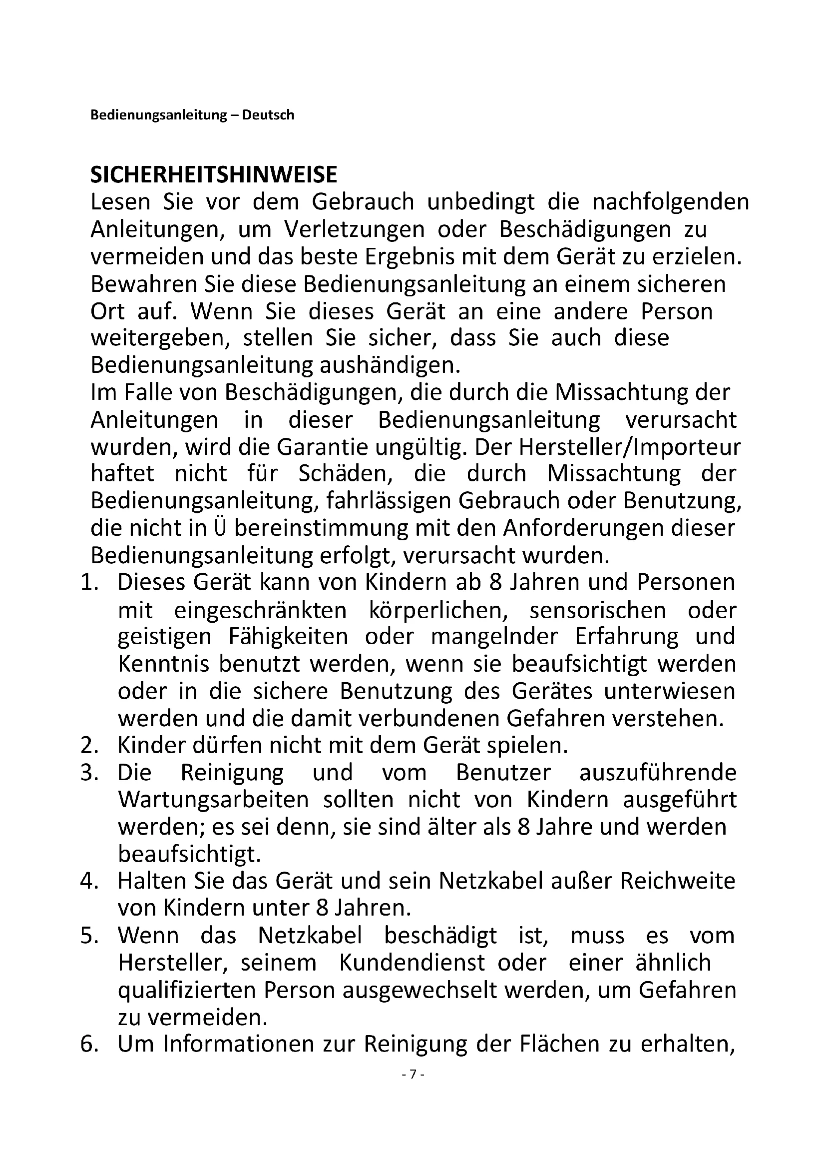 Recycling – European Directive 2012/19/EU This marking indicates that this product should not be disposed with other household wastes. To prevent possible harm to the environment or human health from uncontrolled waste disposal, recycle it responsibly to promote the sustainable reuse of material resources. To return your used device, please use the return and collection systems or contact the retailer where the product was purchased. They can take this product for environmental safe recycling. EMERIO Switzerland AG Industriestrasse 47 6300 Zug Switzerland- 7 - Bedienungsanleitung – Deutsch SICHERHEITSHINWEISE Lesen Sie vor dem Gebrauch unbedingt die nachfolgenden Anleitungen, um Verletzungen oder Beschädigungen zu vermeiden und das beste Ergebnis mit dem Gerät zu erzielen. Bewahren Sie diese Bedienungsanleitung an einem sicheren Ort auf. Wenn Sie dieses Gerät an eine andere Person weitergeben, stellen Sie sicher, dass Sie auch diese Bedienungsanleitung aushändigen. Im Falle von Beschädigungen, die durch die Missachtung der Anleitungen in dieser Bedienungsanleitung verursacht wurden, wird die Garantie ungültig. Der Hersteller/Importeur haftet nicht für Schäden, die durch Missachtung der Bedienungsanleitung, fahrlässigen Gebrauch oder Benutzung, die nicht in Übereinstimmung mit den Anforderungen dieser Bedienungsanleitung erfolgt, verursacht wurden.