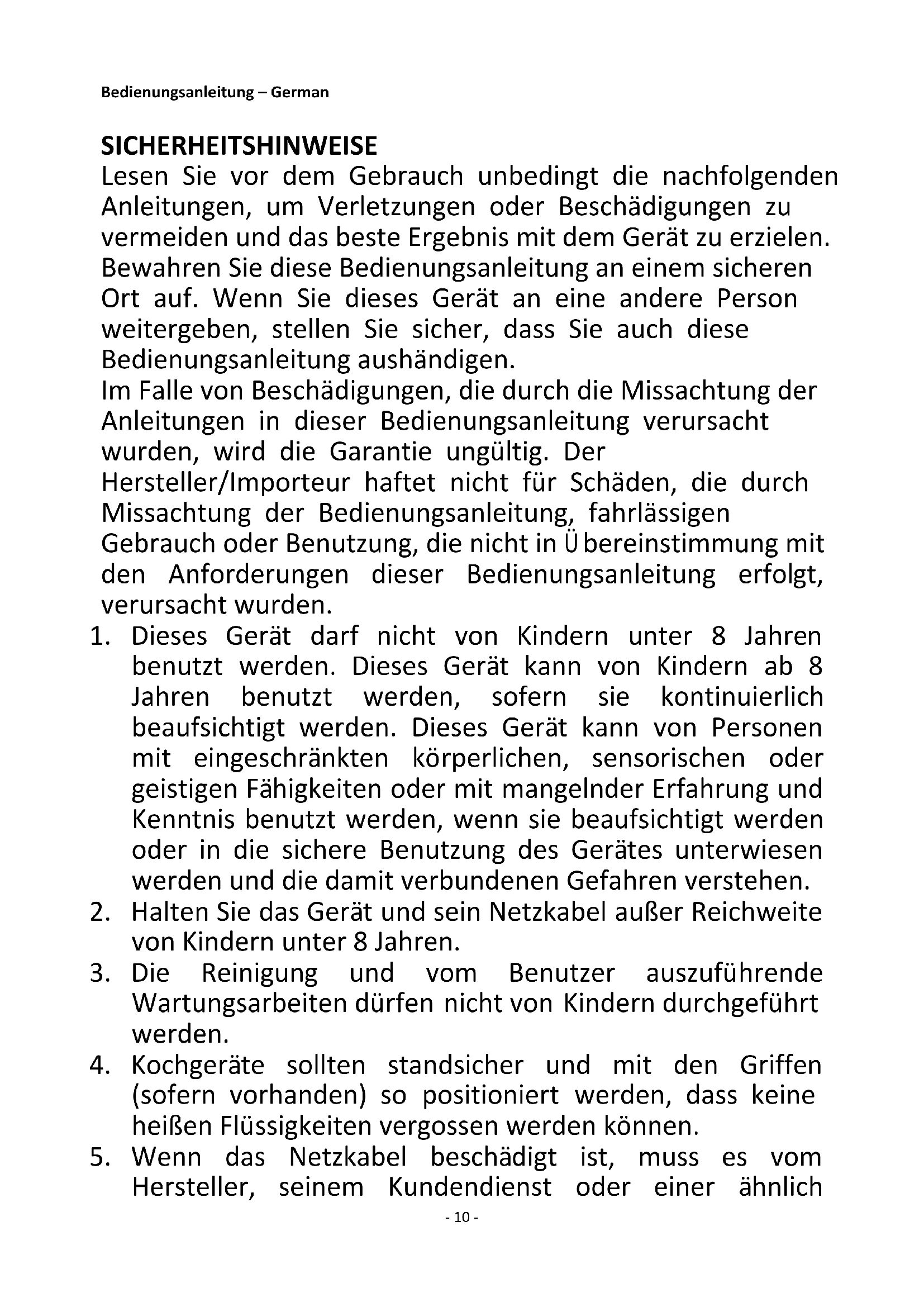10. Versuchen Sie niemals, das Gerät selber zu reparieren bzw. eine beschädigte Netzzuleitung