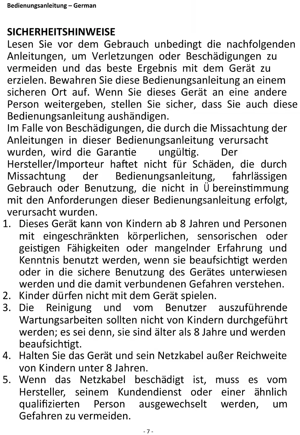 Recycling – European Directive 2012/19/EU This marking indicates that this product should not be disposed with other household wastes. To prevent possible harm to the environment or human health from uncontrolled waste disposal, recycle it responsibly to promote the sustainable reuse of material resources. To return your used device, please use the return and collection systems or contact the retailer where the product was purchased. They can take this product for environmental safe recycling. Emerio Deutschland GmbH (no service address) Lerchenweg 3 40789 Monheim am Rhein Deutschland Customer service: T: +49 (0) 3222 1097 600 E: info.de@emerio.eu- 7 - Bedienungsanleitung – German SICHERHEITSHINWEISE Lesen Sie vor dem Gebrauch unbedingt die nachfolgenden Anleitungen, um Verletzungen oder Beschädigungen zu vermeiden und das beste Ergebnis mit dem Gerät zu erzielen. Bewahren Sie diese Bedienungsanleitung an einem sicheren Ort auf. Wenn Sie dieses Gerät an eine andere Person weitergeben, stellen Sie sicher, dass Sie auch diese Bedienungsanleitung aushändigen. Im Falle von Beschädigungen, die durch die Missachtung der Anleitungen in dieser Bedienungsanleitung verursacht wurden, wird die Garantie ungültig. Der Hersteller/Importeur haftet nicht für Schäden, die durch Missachtung der Bedienungsanleitung, fahrlässigen Gebrauch oder Benutzung, die nicht in Übereinstimmung mit den Anforderungen dieser Bedienungsanleitung erfolgt, verursacht wurden.