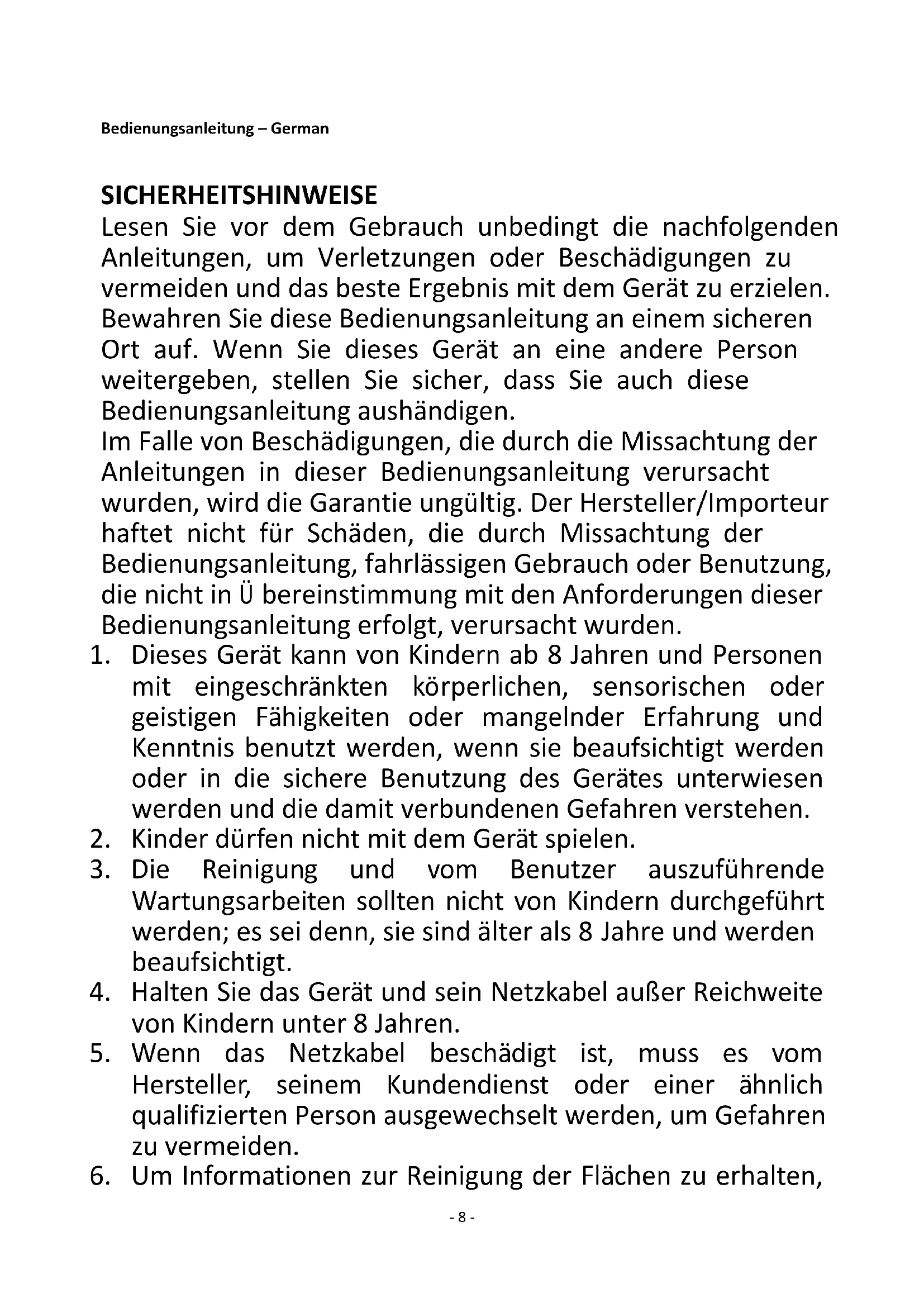 Recycling – European Directive 2012/19/EU This marking indicates that this product should not be disposed with other household wastes. To prevent possible harm to the environment or human health from uncontrolled waste disposal, recycle it responsibly to promote the sustainable reuse of material resources. To return your used device, please use the return and collection systems or contact the retailer where the product was purchased. They can take this product for environmental safe recycling. Emerio B.V. Customer service: Kundeninformation: Klantenservice: Oudeweg 115 T: +31 (0) 23 3034369 T: +49 (0) 3222 1097 600 T: +31 (0) 23 3034369 2031 CC Haarlem www.emerio.eu/service www.emerio.eu/service www.emerio.eu/service The Netherlands Looking for spare parts? Have a look at https://spareparts.emerio.eu Sie brauchen Ersatzteile? Besuchen Sie https://ersatzteile.emerio.eu Onderdelen nodig? Kijk op https://onderdelen.emerio.eu- 8 - Bedienungsanleitung – German SICHERHEITSHINWEISE Lesen Sie vor dem Gebrauch unbedingt die nachfolgenden Anleitungen, um Verletzungen oder Beschädigungen zu vermeiden und das beste Ergebnis mit dem Gerät zu erzielen. Bewahren Sie diese Bedienungsanleitung an einem sicheren Ort auf. Wenn Sie dieses Gerät an eine andere Person weitergeben, stellen Sie sicher, dass Sie auch diese Bedienungsanleitung aushändigen. Im Falle von Beschädigungen, die durch die Missachtung der Anleitungen in dieser Bedienungsanleitung verursacht wurden, wird die Garantie ungültig. Der Hersteller/Importeur haftet nicht für Schäden, die durch Missachtung der Bedienungsanleitung, fahrlässigen Gebrauch oder Benutzung, die nicht in Übereinstimmung mit den Anforderungen dieser Bedienungsanleitung erfolgt, verursacht wurden.