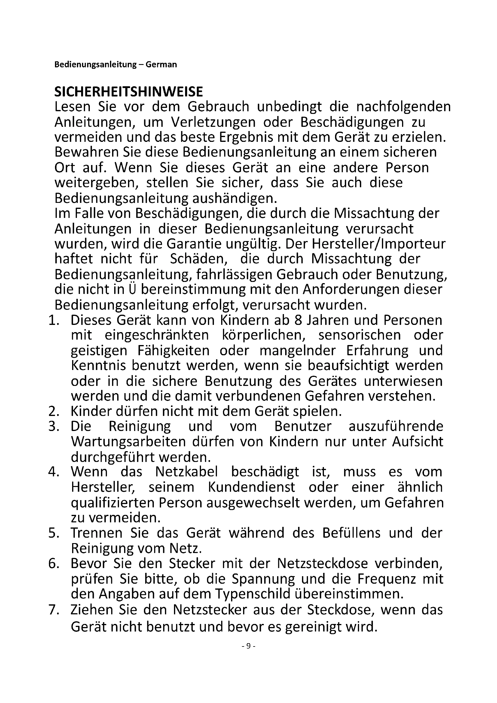 Regarding information for consumers on how to install, use and maintain the product, WEEE information, please check the instruction manual provided with packaging.- 9 - Bedienungsanleitung – German SICHERHEITSHINWEISE Lesen Sie vor dem Gebrauch unbedingt die nachfolgenden Anleitungen, um Verletzungen oder Beschädigungen zu vermeiden und das beste Ergebnis mit dem Gerät zu erzielen. Bewahren Sie diese Bedienungsanleitung an einem sicheren Ort auf. Wenn Sie dieses Gerät an eine andere Person weitergeben, stellen Sie sicher, dass Sie auch diese Bedienungsanleitung aushändigen. Im Falle von Beschädigungen, die durch die Missachtung der Anleitungen in dieser Bedienungsanleitung verursacht wurden, wird die Garantie ungültig. Der Hersteller/Importeur haftet nicht für Schäden, die durch Missachtung der Bedienungsanleitung, fahrlässigen Gebrauch oder Benutzung, die nicht in Übereinstimmung mit den Anforderungen dieser Bedienungsanleitung erfolgt, verursacht wurden.